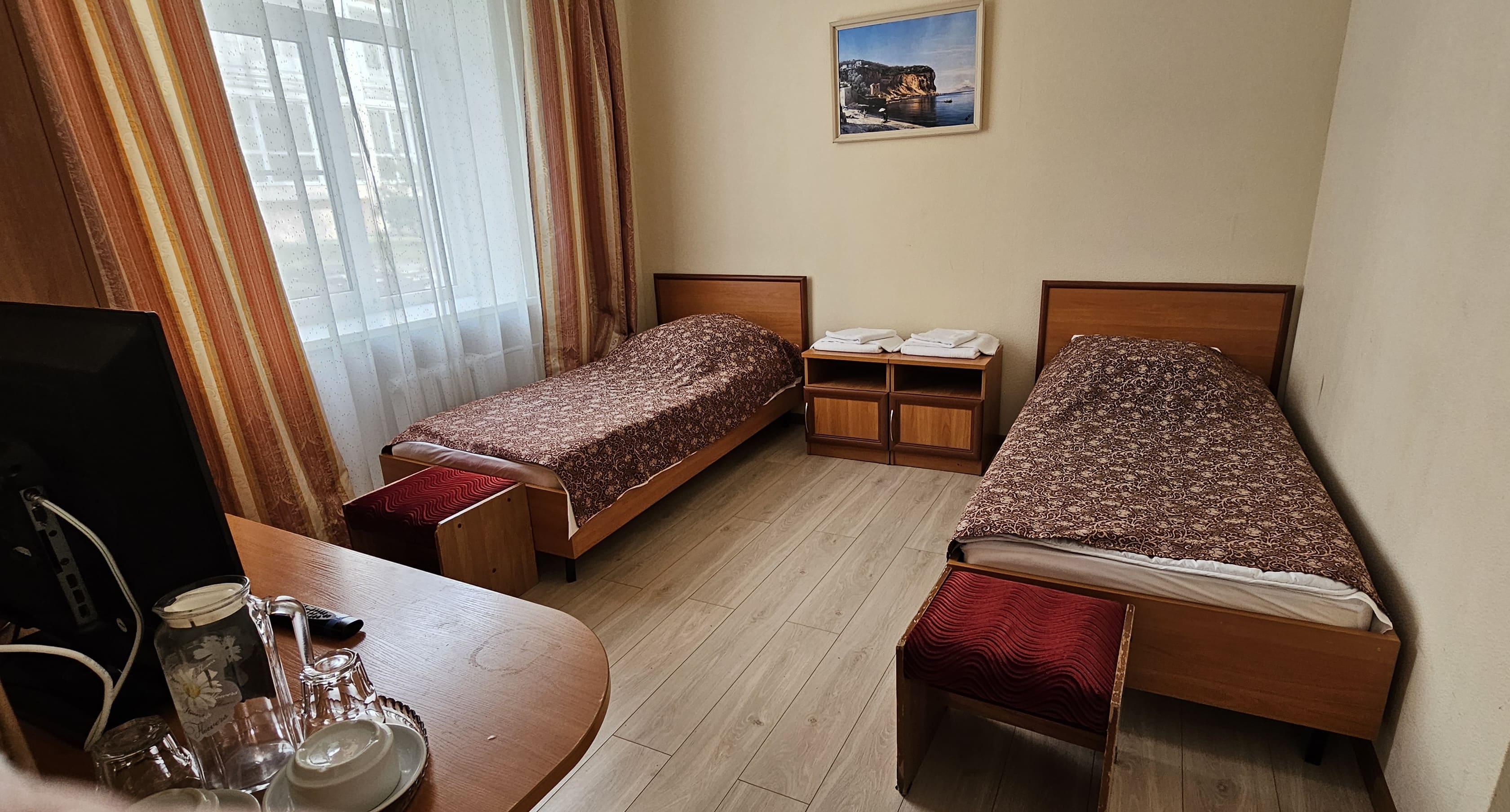 холодильник, телевизор, балкон, санузел с душевой кабиной, шкаф, прикроватные тумбочки, односпальная кровать: 2 шт, ванная комната