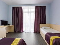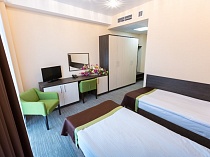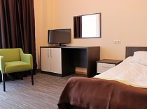 холодильник, кондиционер, телевизор, фен, санузел с душевой кабиной, ванные принадлежности, шкаф, односпальная кровать, стол, прикроватная тумба, кресло