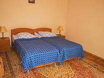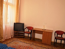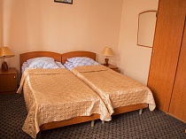 холодильник, телевизор, фен, гладильная доска, утюг, санузел с душевой кабиной, шкаф, односпальная кровать: 2 шт, электрочайник, стол, зеркало, прикроватная тумба, посуда, набор полотенец