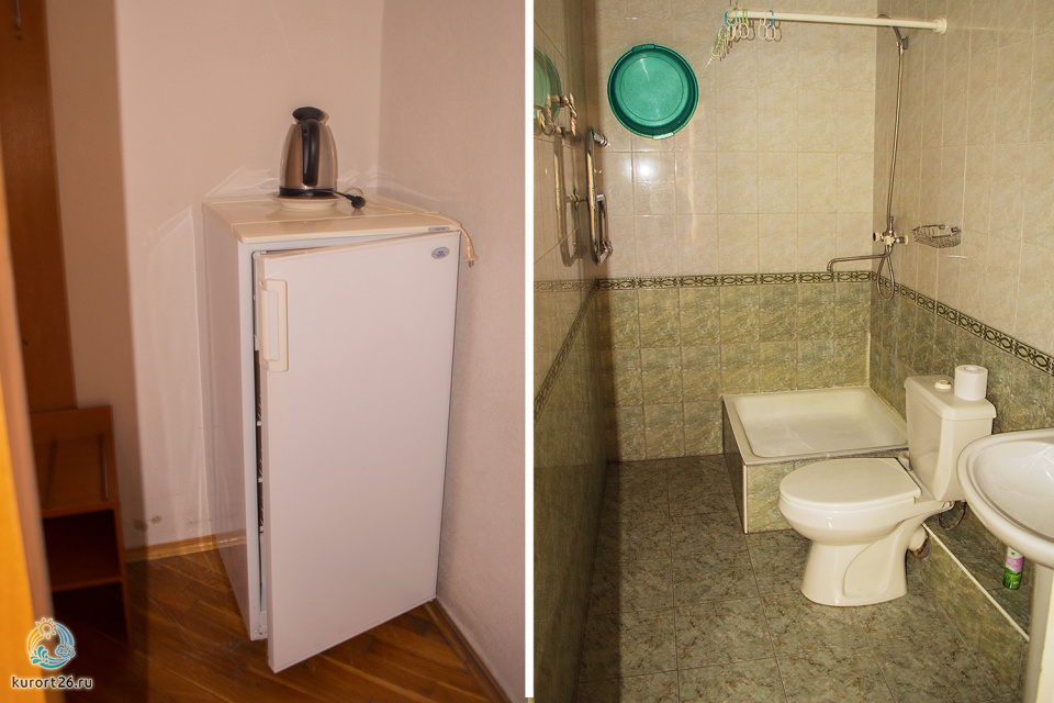холодильник, телевизор, фен, гладильная доска, утюг, санузел с душевой кабиной, шкаф, односпальная кровать: 2 шт, электрочайник, стол, зеркало, прикроватная тумба, посуда, набор полотенец