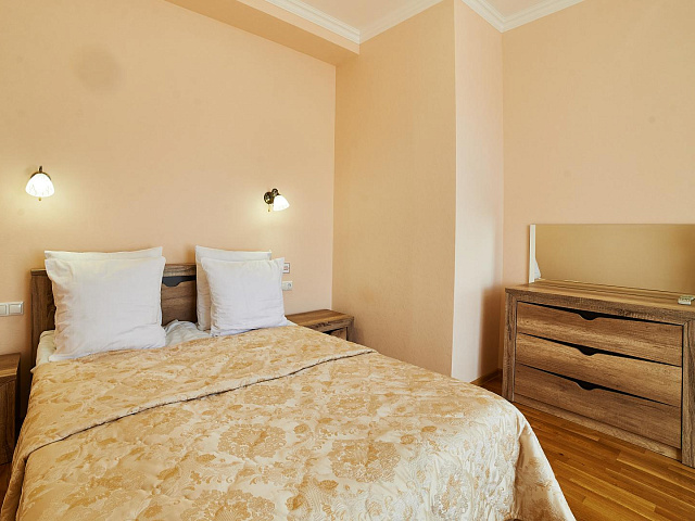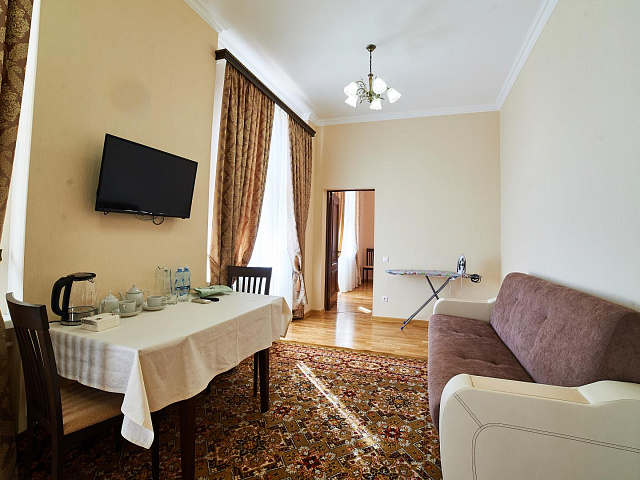 холодильник, телевизор, интернет в номере, ванные принадлежности, двуспальная кровать, шкаф, обеденный стол, диван, ванная комната