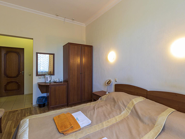 холодильник, телевизор, интернет в номере, ванные принадлежности, двуспальная кровать, шкаф, обеденный стол, диван, ванная комната