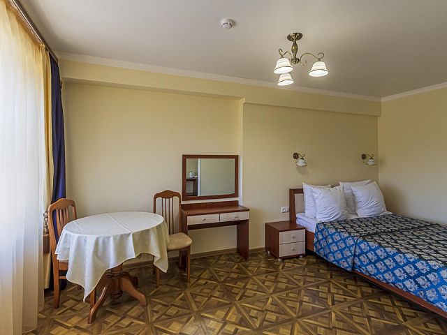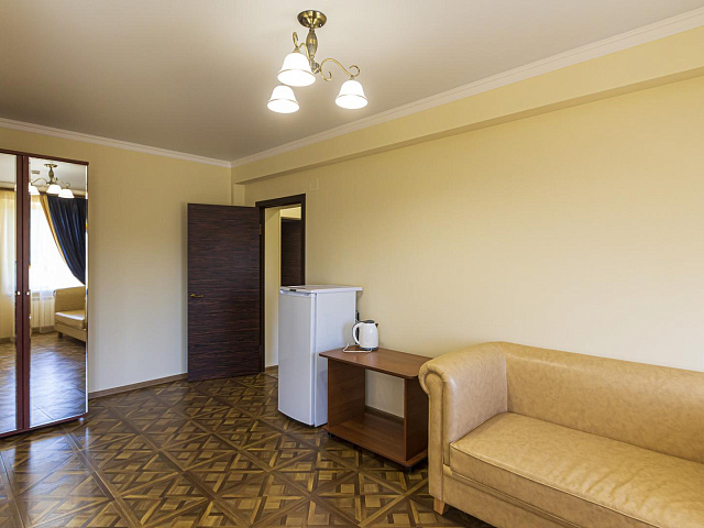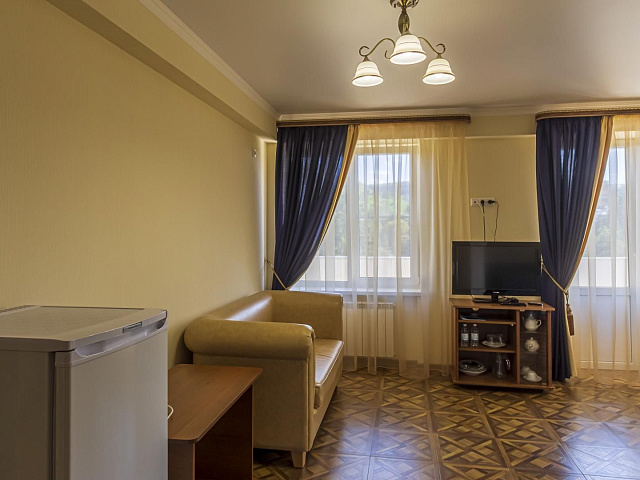 холодильник, телевизор, интернет в номере, ванные принадлежности, двуспальная кровать, шкаф, обеденный стол, диван, ванная комната