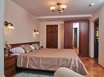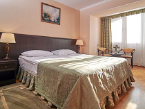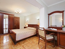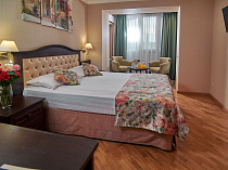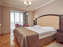 холодильник, кондиционер, телевизор, фен, сейф, телефон, халат, тапочки, двуспальная кровать, микроволновая печь, кресло, журнальный столик, набор косметических средств, набор полотенец, Рабочая зона с письменным столом и удобным стулом, Душевая кабина, кухонное оборудование, ванная, чайный набор, биде