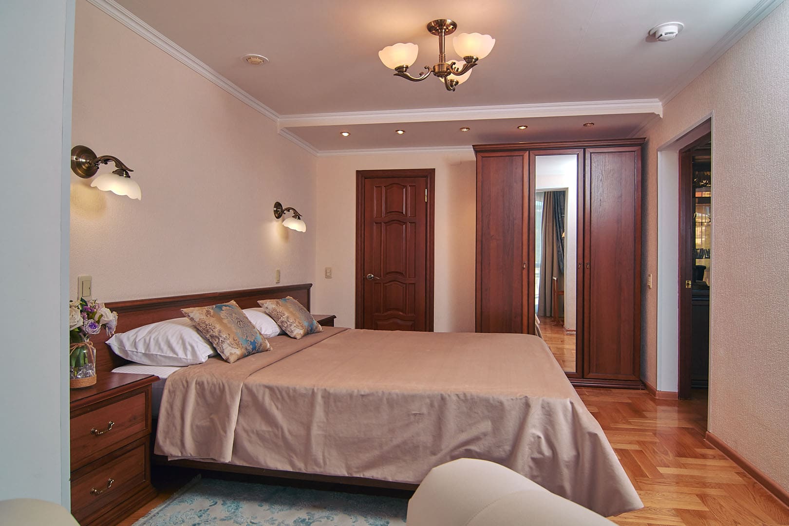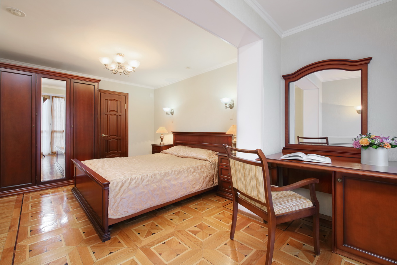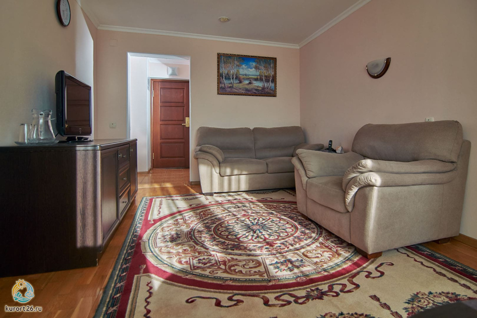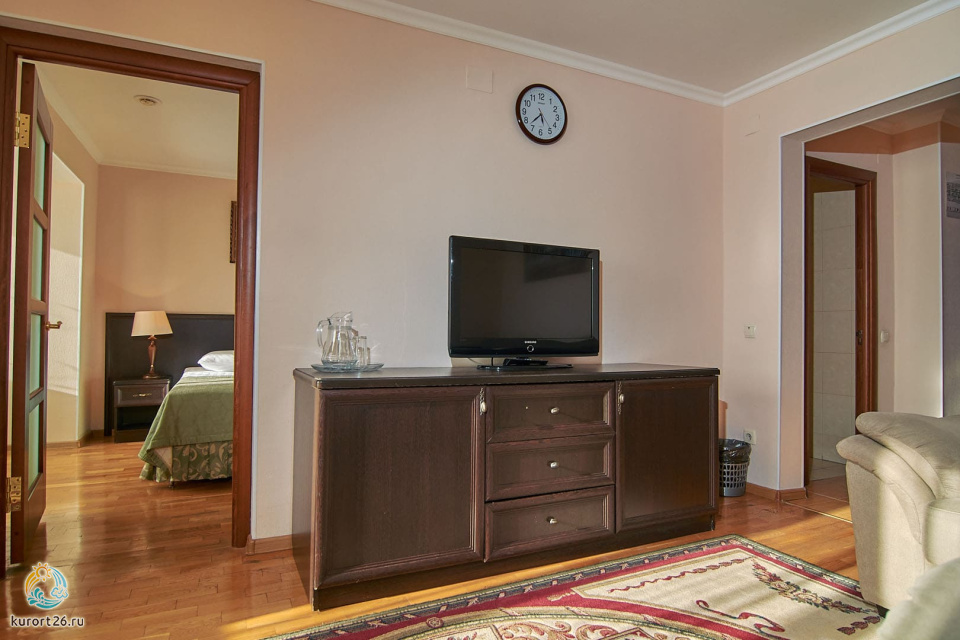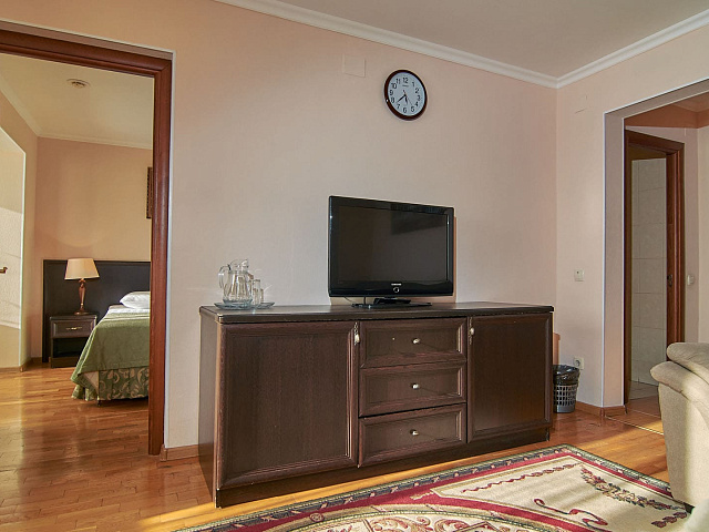 холодильник, кондиционер, телевизор, фен, сейф, душ, телефон, халат, тапочки, двуспальная кровать, микроволновая печь, ванна, кресло, журнальный столик, набор косметических средств, набор полотенец, Рабочая зона с письменным столом и удобным стулом, кухонное оборудование, чайный набор, биде