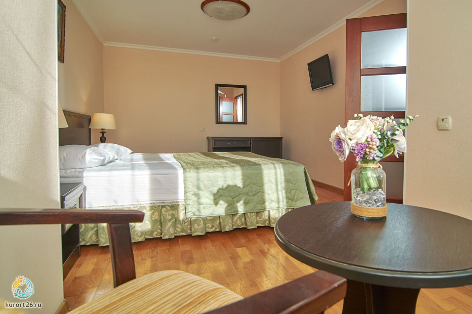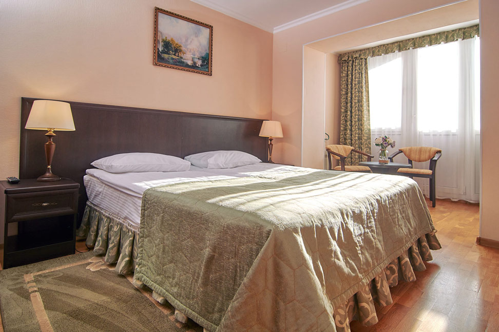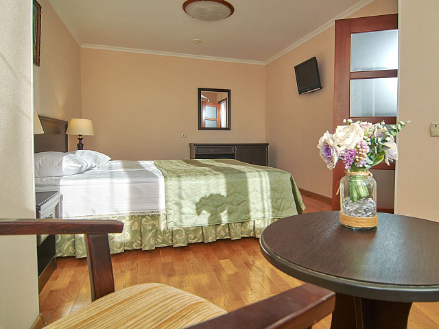 телевизор, фен, сейф, телефон, мини-бар, двуспальная кровать, кресло, журнальный столик, набор косметических средств, набор полотенец, Рабочая зона с письменным столом и удобным стулом, Душевая кабина
