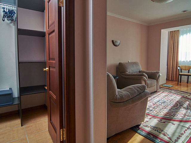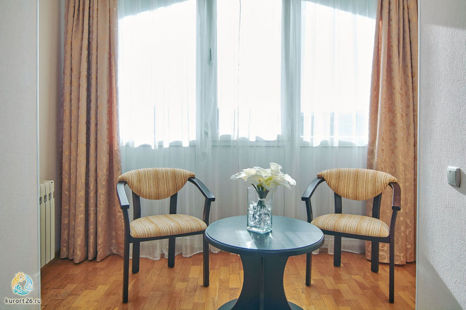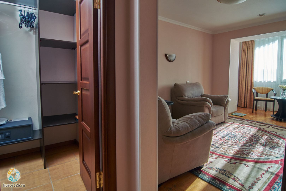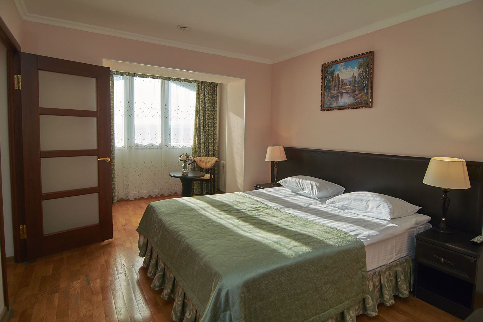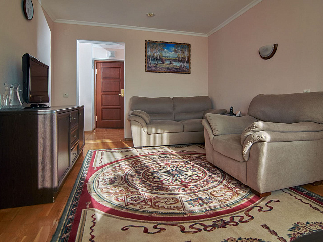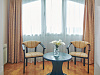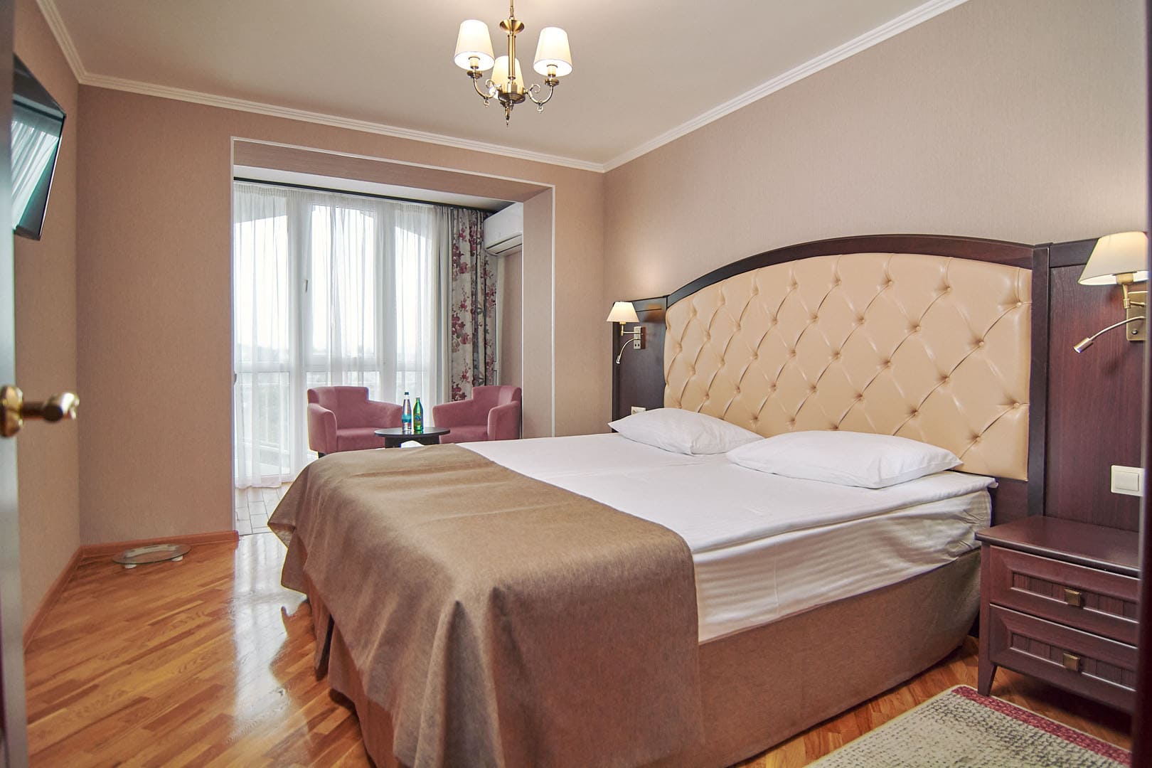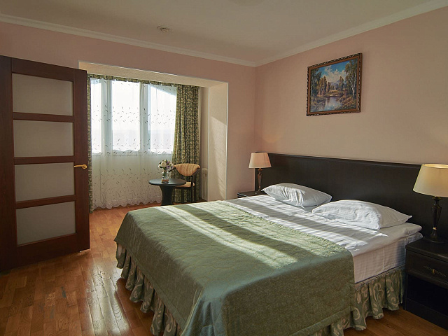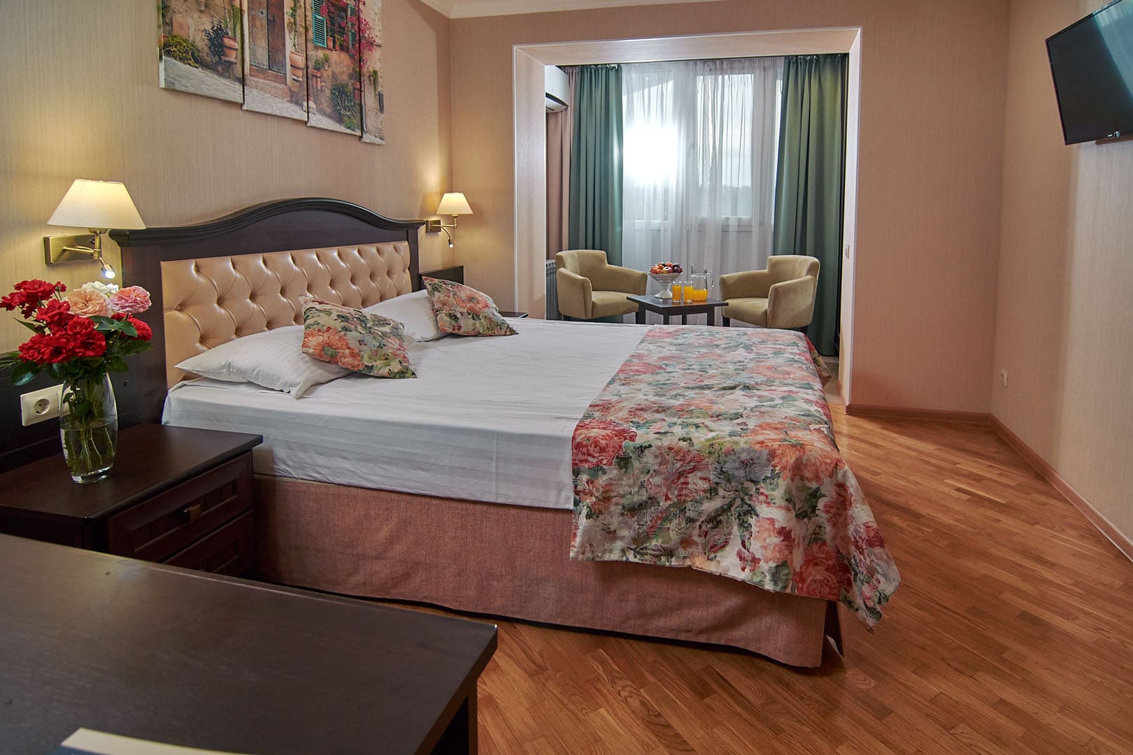 холодильник, кондиционер, фен, сейф, душ, телефон, халат, тапочки, двуспальная кровать, ванна, кресло, журнальный столик, набор косметических средств, набор полотенец, Рабочая зона с письменным столом и удобным стулом