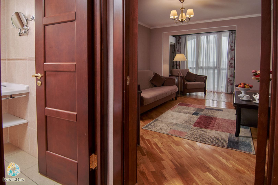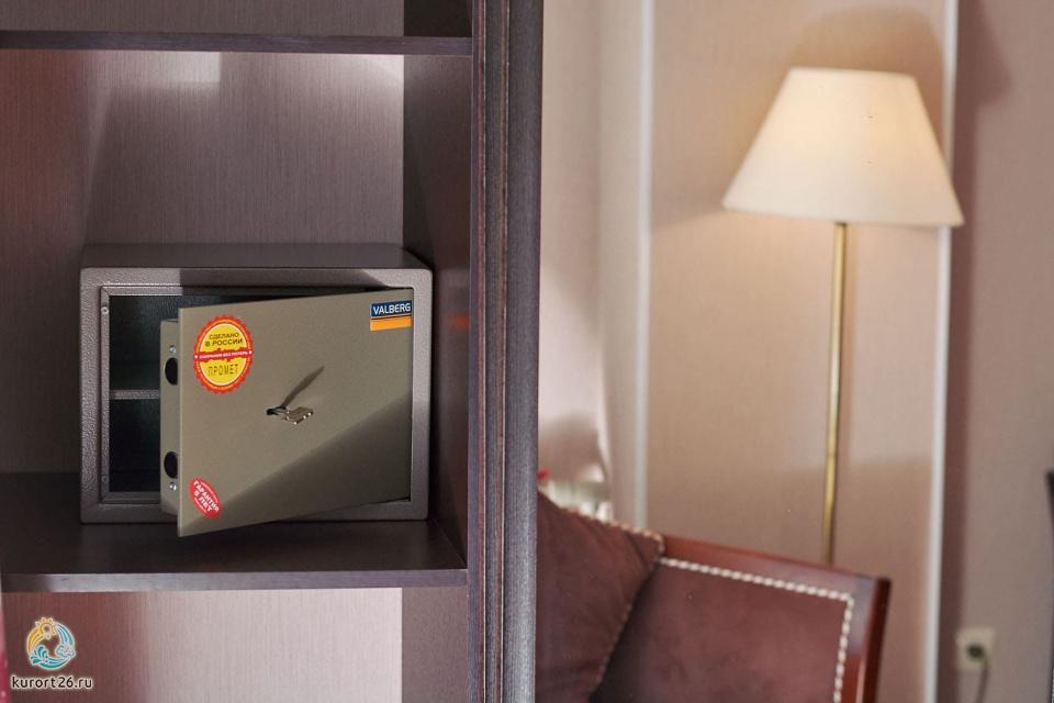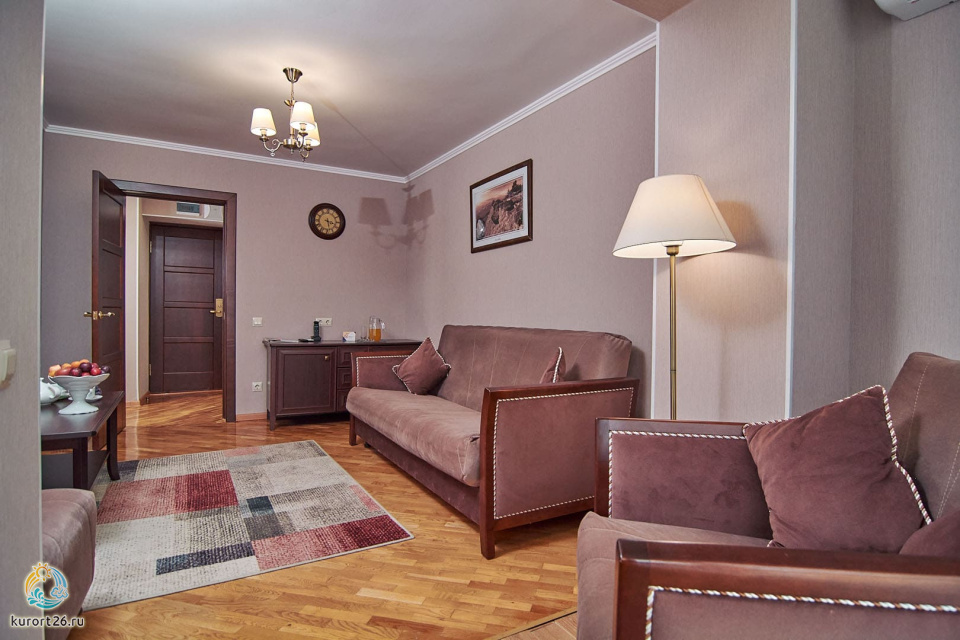 холодильник, кондиционер, фен, сейф, душ, телефон, халат, тапочки, двуспальная кровать, ванна, кресло, журнальный столик, набор косметических средств, набор полотенец, Рабочая зона с письменным столом и удобным стулом