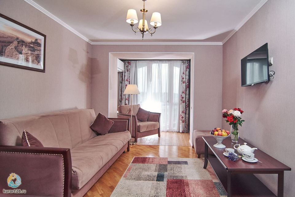 холодильник, кондиционер, телевизор, фен, сейф, душ, телефон, халат, тапочки, двуспальная кровать, микроволновая печь, ванна, кресло, журнальный столик, набор косметических средств, набор полотенец, Рабочая зона с письменным столом и удобным стулом, кухонное оборудование, чайный набор, биде