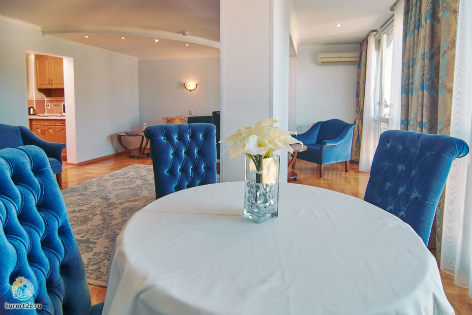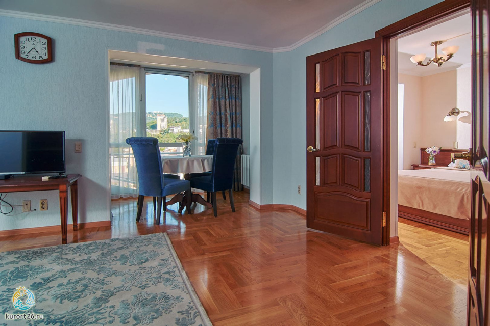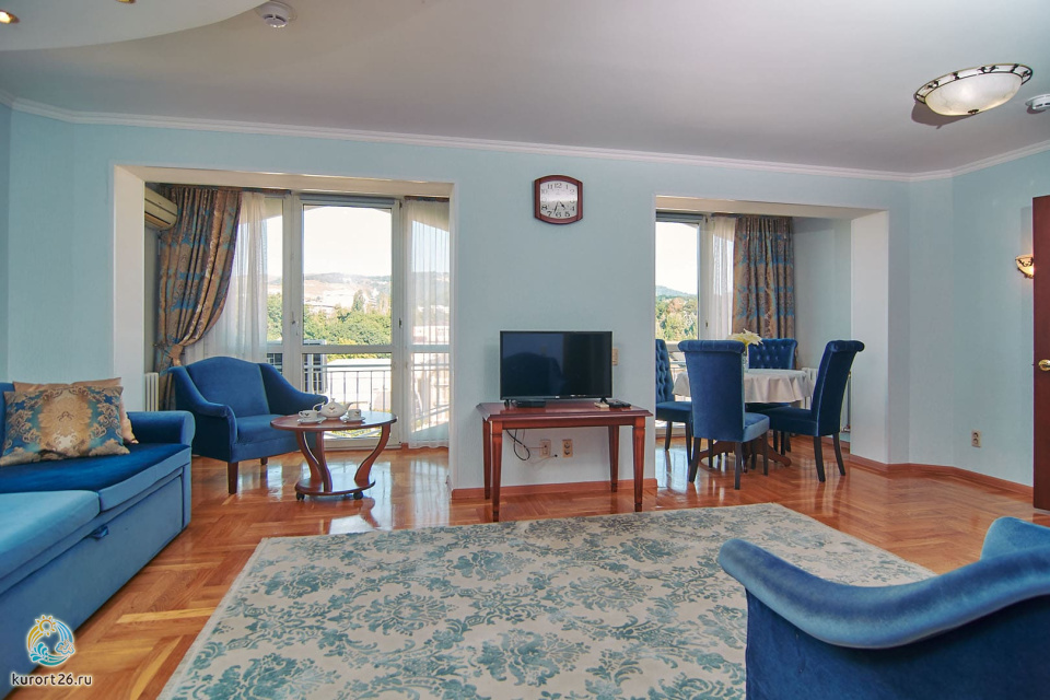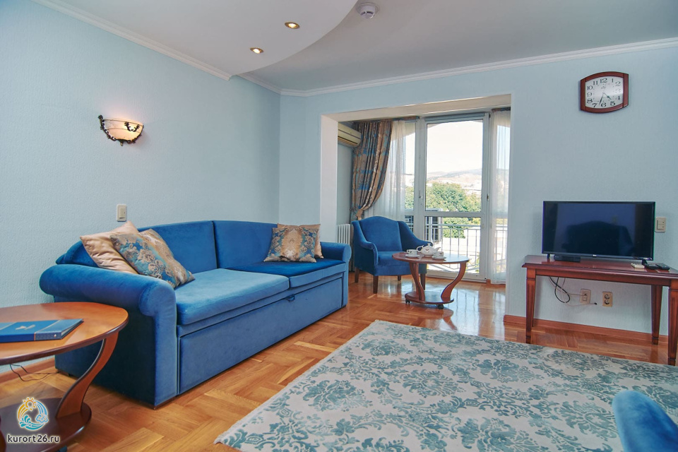 холодильник, кондиционер, телевизор, фен, сейф, душ, телефон, халат, тапочки, двуспальная кровать, микроволновая печь, ванна, кресло, журнальный столик, набор косметических средств, набор полотенец, Рабочая зона с письменным столом и удобным стулом, кухонное оборудование, чайный набор, биде