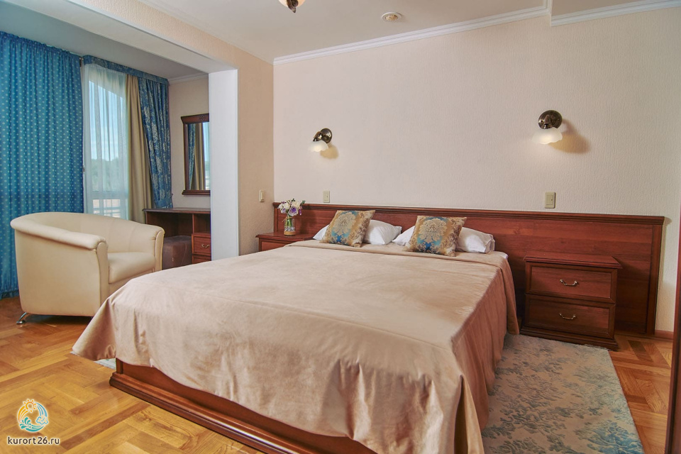 холодильник, кондиционер, фен, сейф, душ, телефон, халат, тапочки, двуспальная кровать, ванна, кресло, журнальный столик, набор косметических средств, набор полотенец, Рабочая зона с письменным столом и удобным стулом