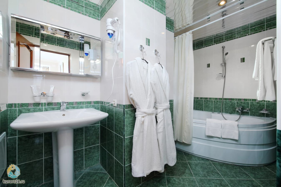 холодильник, телевизор, фен, сейф, телефон, халат, тапочки, двуспальная кровать, ванна, кресло, журнальный столик, набор косметических средств, набор полотенец, Рабочая зона с письменным столом и удобным стулом, Душевая кабина