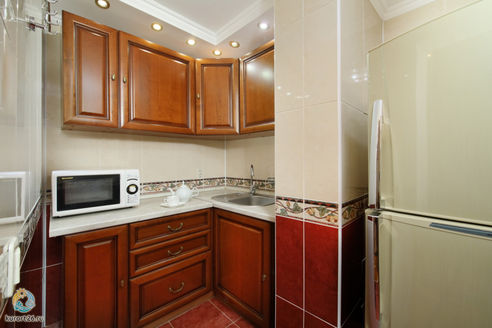 холодильник, кондиционер, телевизор, фен, сейф, телефон, халат, тапочки, двуспальная кровать, микроволновая печь, кресло, журнальный столик, набор косметических средств, набор полотенец, Рабочая зона с письменным столом и удобным стулом, Душевая кабина, кухонное оборудование, ванная, чайный набор, биде