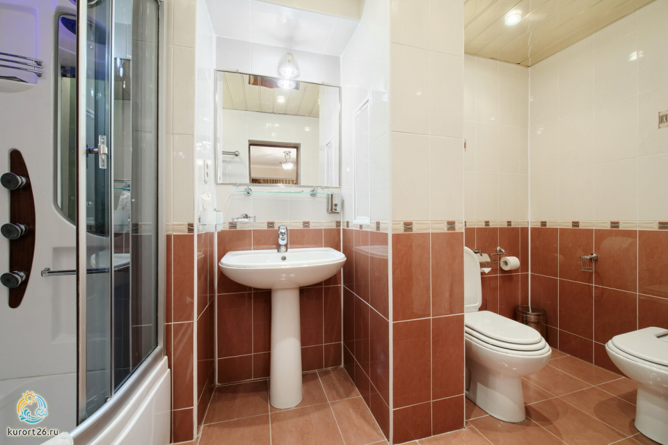 холодильник, кондиционер, телевизор, фен, сейф, душ, телефон, халат, тапочки, двуспальная кровать, кресло, журнальный столик, набор косметических средств, набор полотенец, Душевая кабина