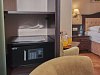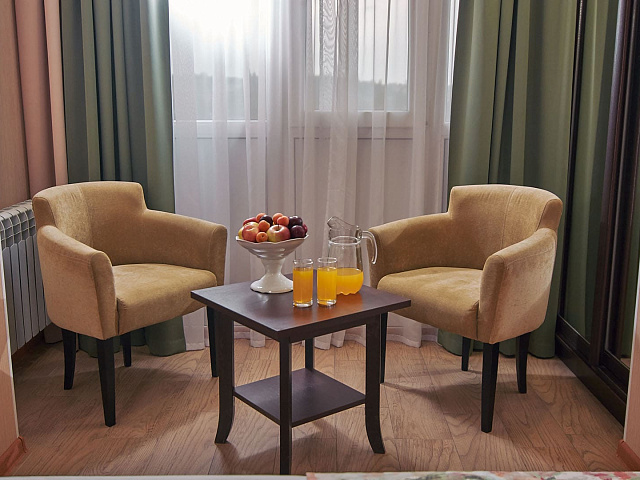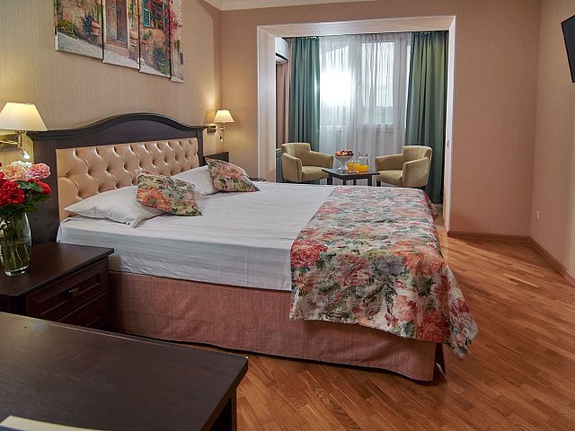 холодильник, кондиционер, фен, сейф, душ, телефон, халат, тапочки, двуспальная кровать, ванна, кресло, журнальный столик, набор косметических средств, набор полотенец, Рабочая зона с письменным столом и удобным стулом