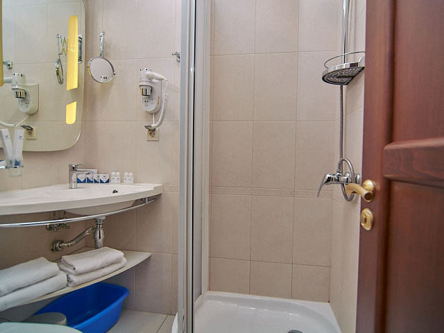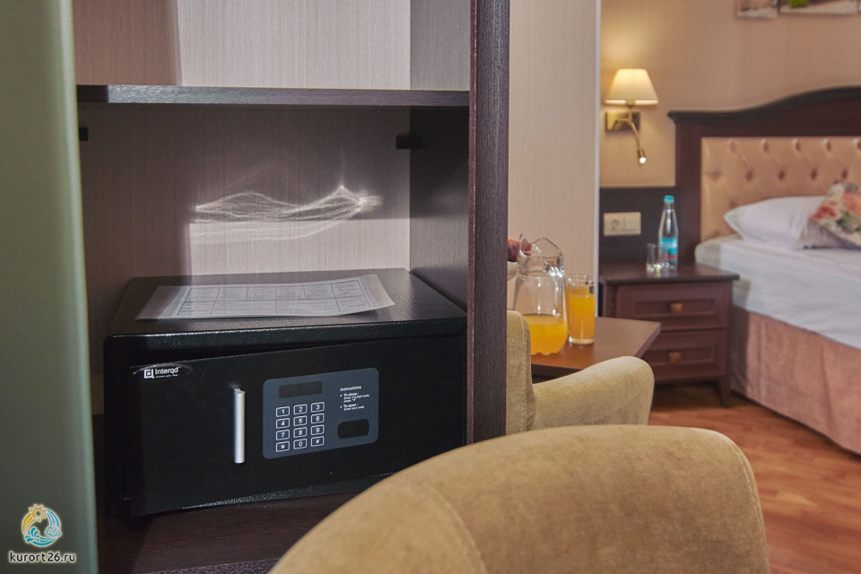 телевизор, фен, сейф, телефон, мини-бар, двуспальная кровать, кресло, журнальный столик, набор косметических средств, набор полотенец, Рабочая зона с письменным столом и удобным стулом, Душевая кабина