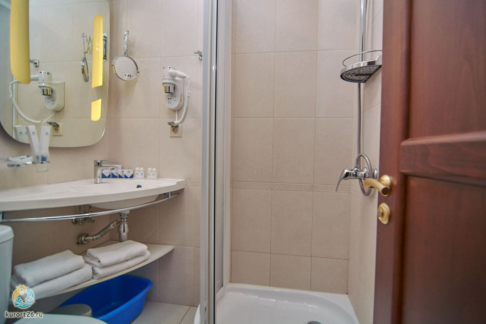 холодильник, кондиционер, телевизор, фен, сейф, душ, телефон, халат, тапочки, двуспальная кровать, кресло, журнальный столик, набор косметических средств, набор полотенец, Душевая кабина