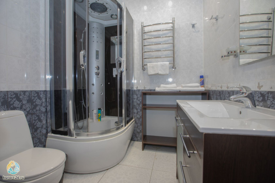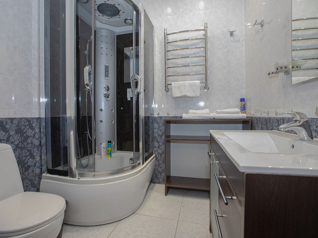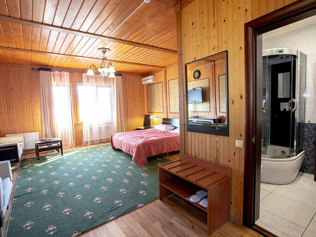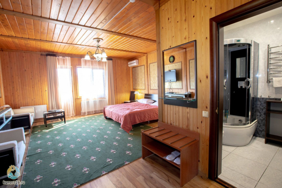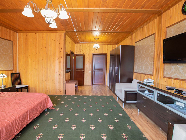 холодильник, телевизор, интернет в номере, санузел с душевой кабиной, ванные принадлежности, двуспальная кровать, шкаф, набор мягкой мебели, прикроватные тумбочки, электрочайник, стол