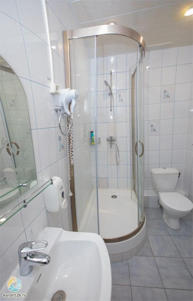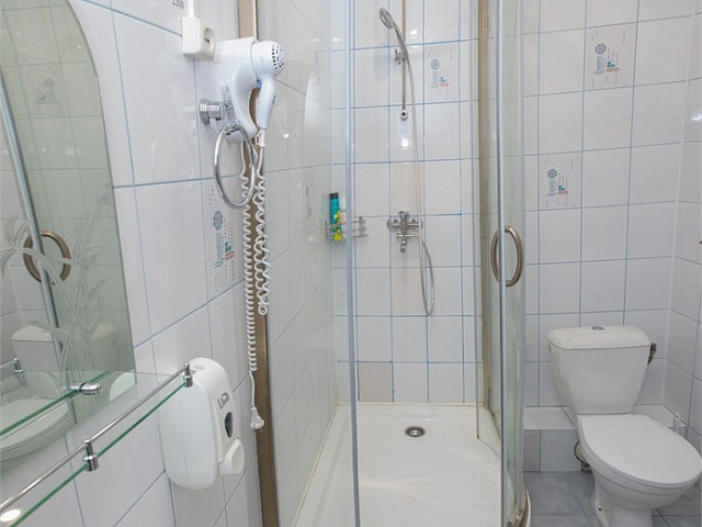 холодильник, кондиционер, телевизор, набор чайной посуды, телефон, интернет в номере, санузел с душевой кабиной, ванные принадлежности, электрочайник, стол, прикроватная тумба, полутороспальная кровать, ванная комната с душевой кабиной, гигиенические принадлежности