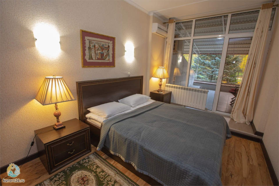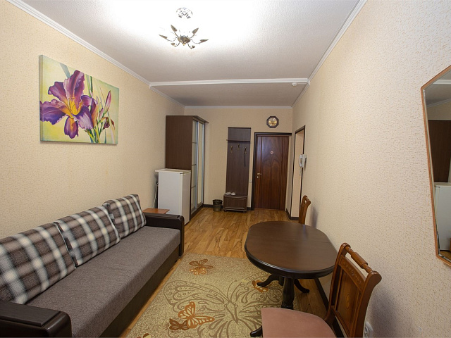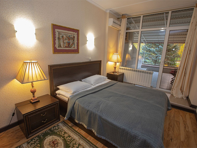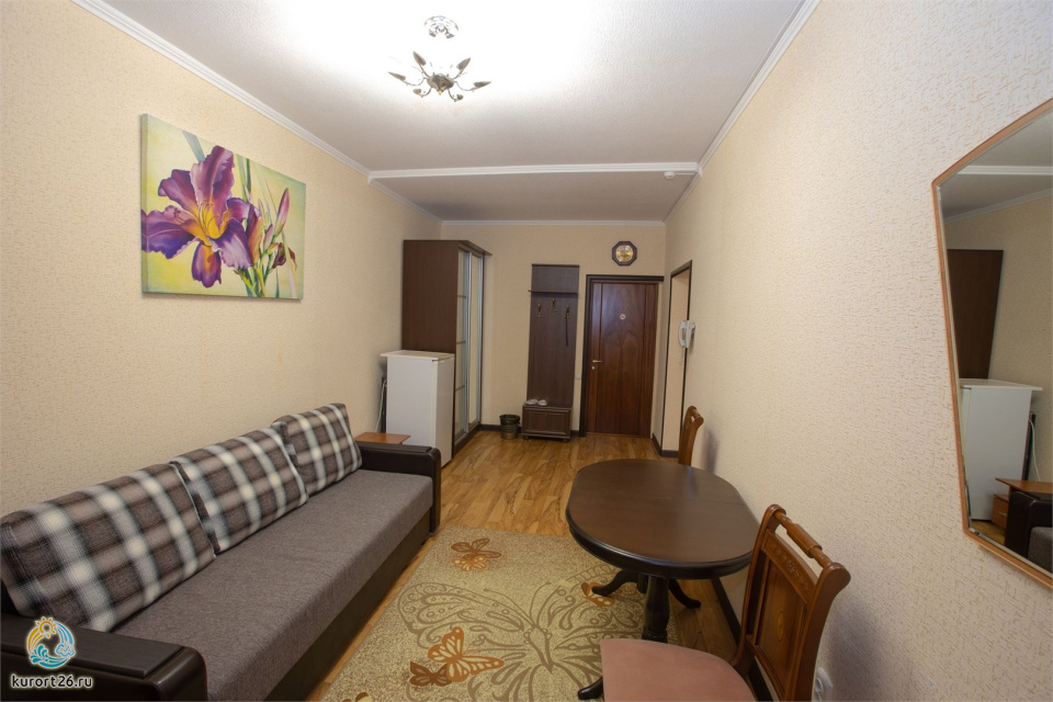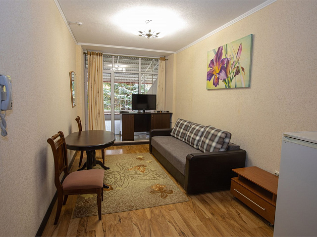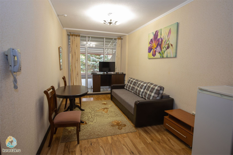 холодильник, телевизор, интернет в номере, санузел с душевой кабиной, ванные принадлежности, двуспальная кровать, шкаф, набор мягкой мебели, прикроватные тумбочки, электрочайник, стол
