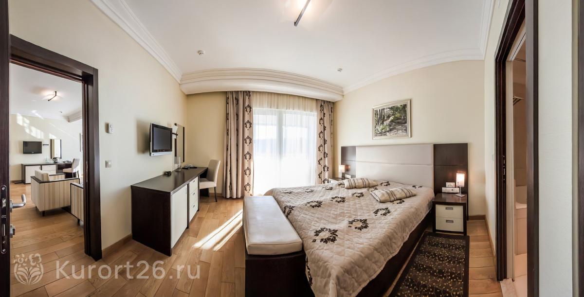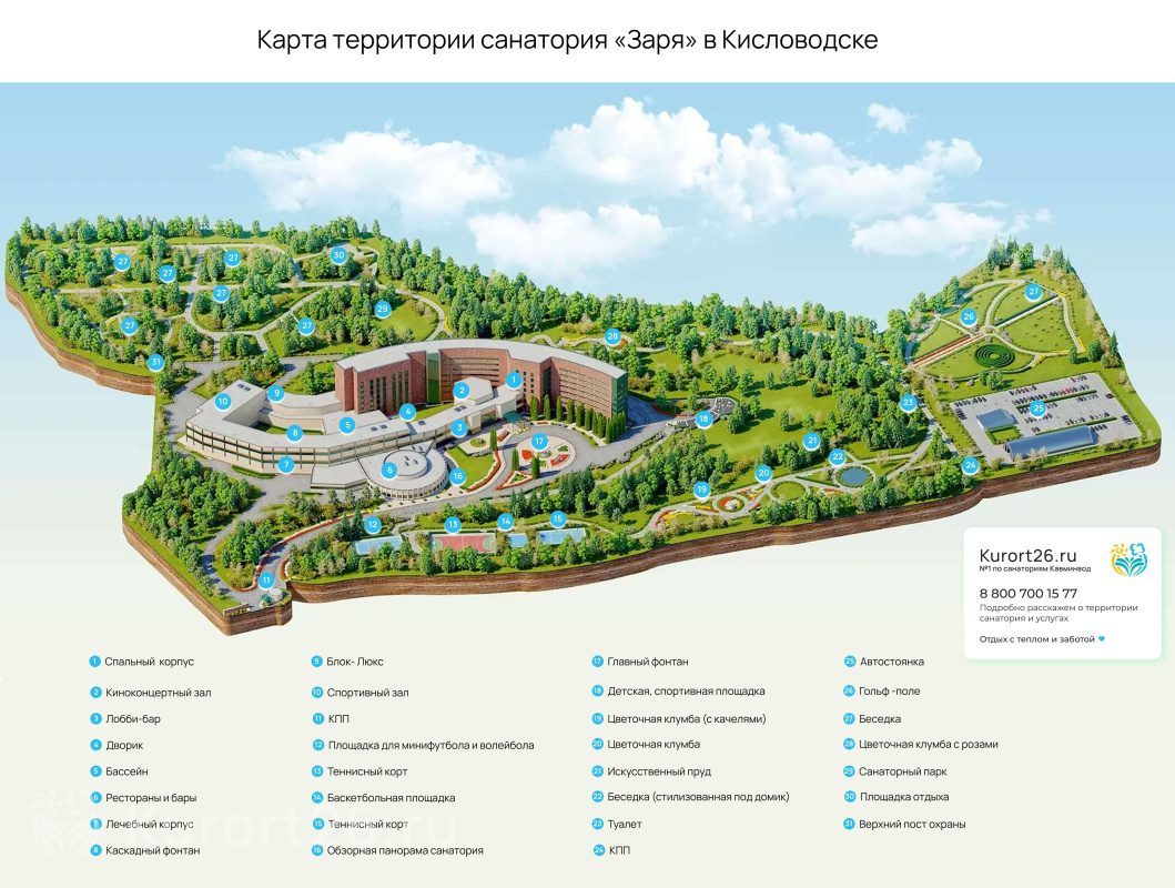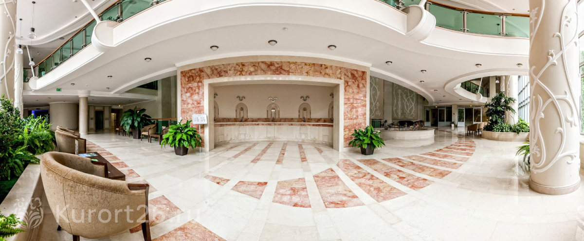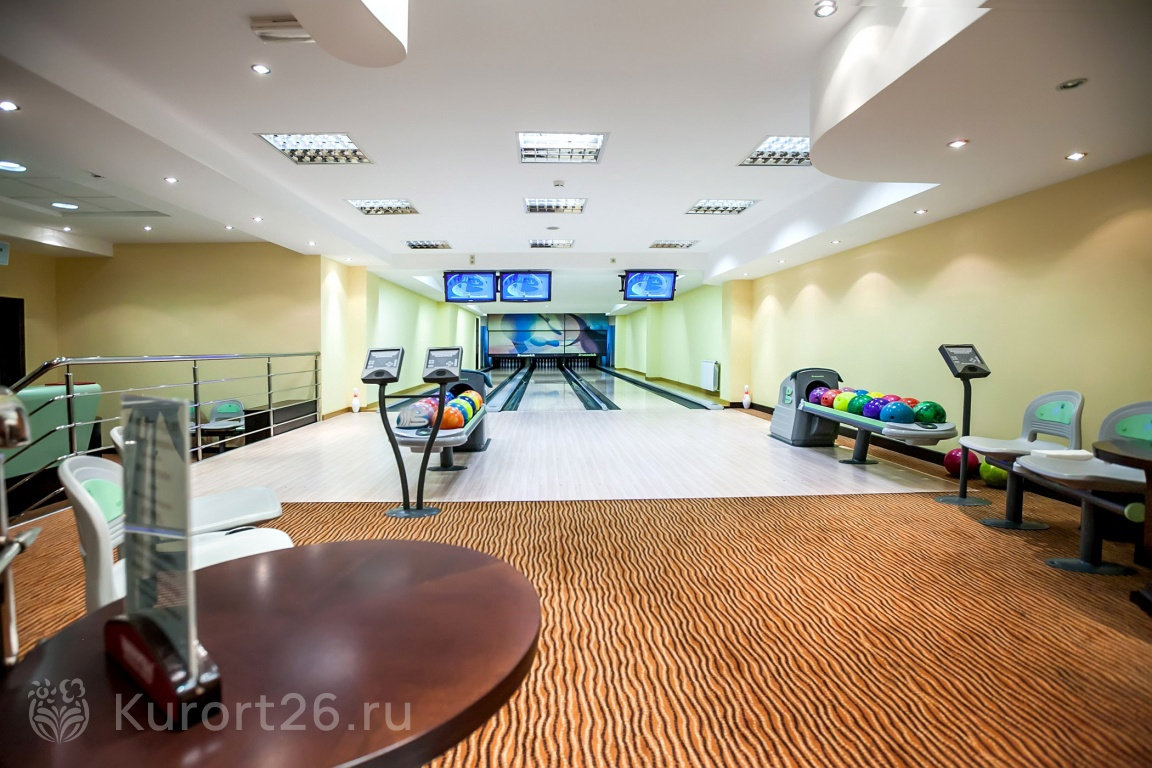 - Масштабный санаторный комплекс в сильным медцентром, номерами отельного типа, ресторанами, бассейном, развлекательным центром, боулингом, бильярдом, теннисными кортами, гольф-полем