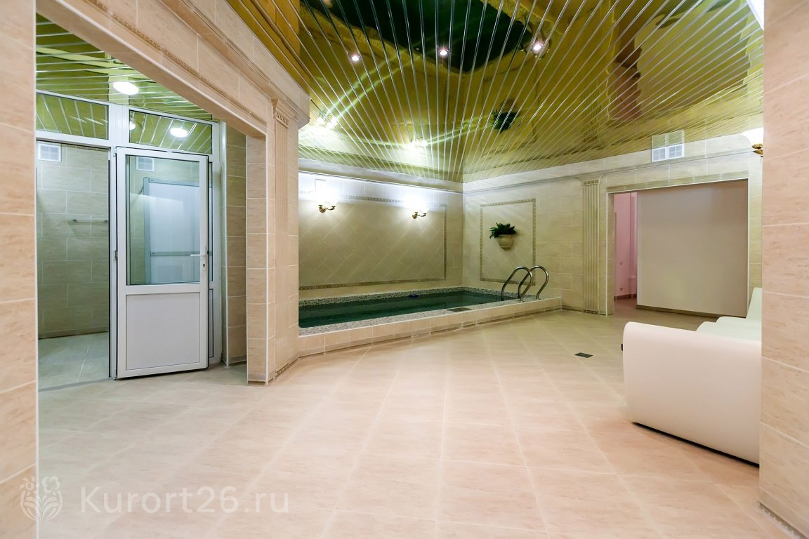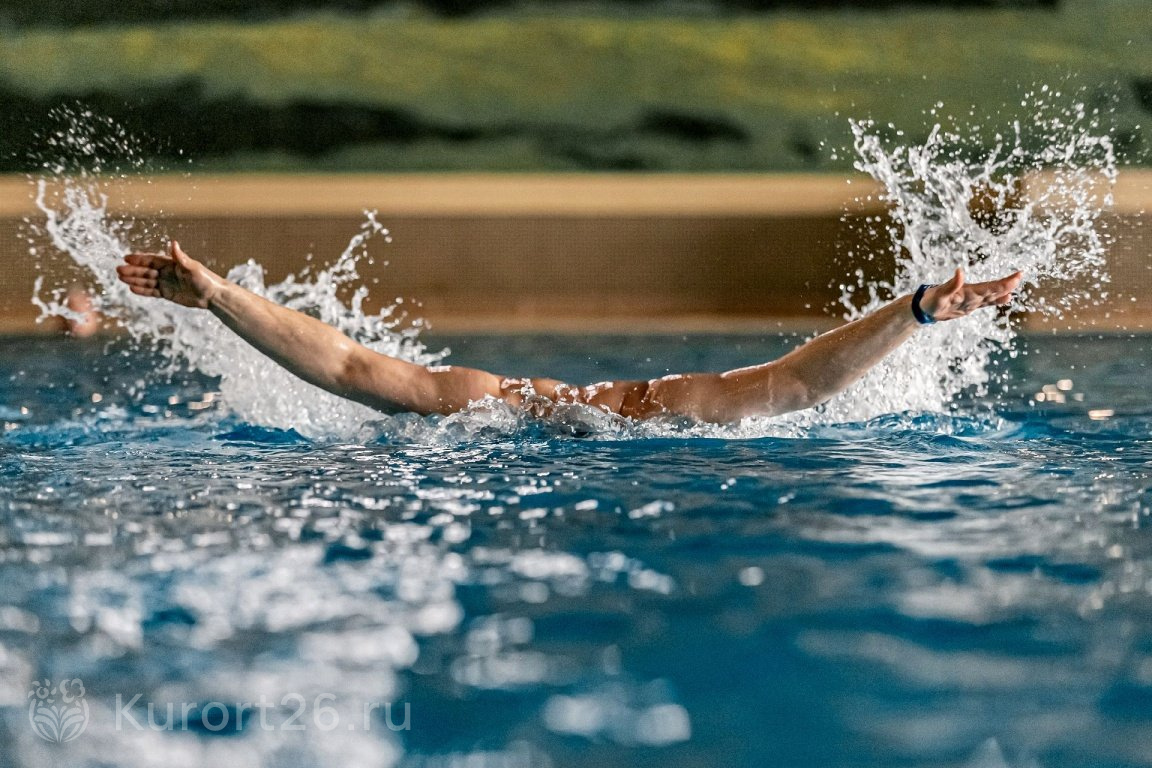 - Крытый бассейн 375 кв.м. (25×15 м) с гейзерами, каскадом и современной системой очистки воды без хлора. В бассейне проводятся занятия плаванием и аквааэробикой с инструктором