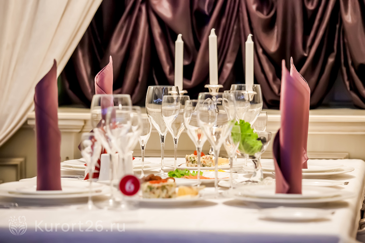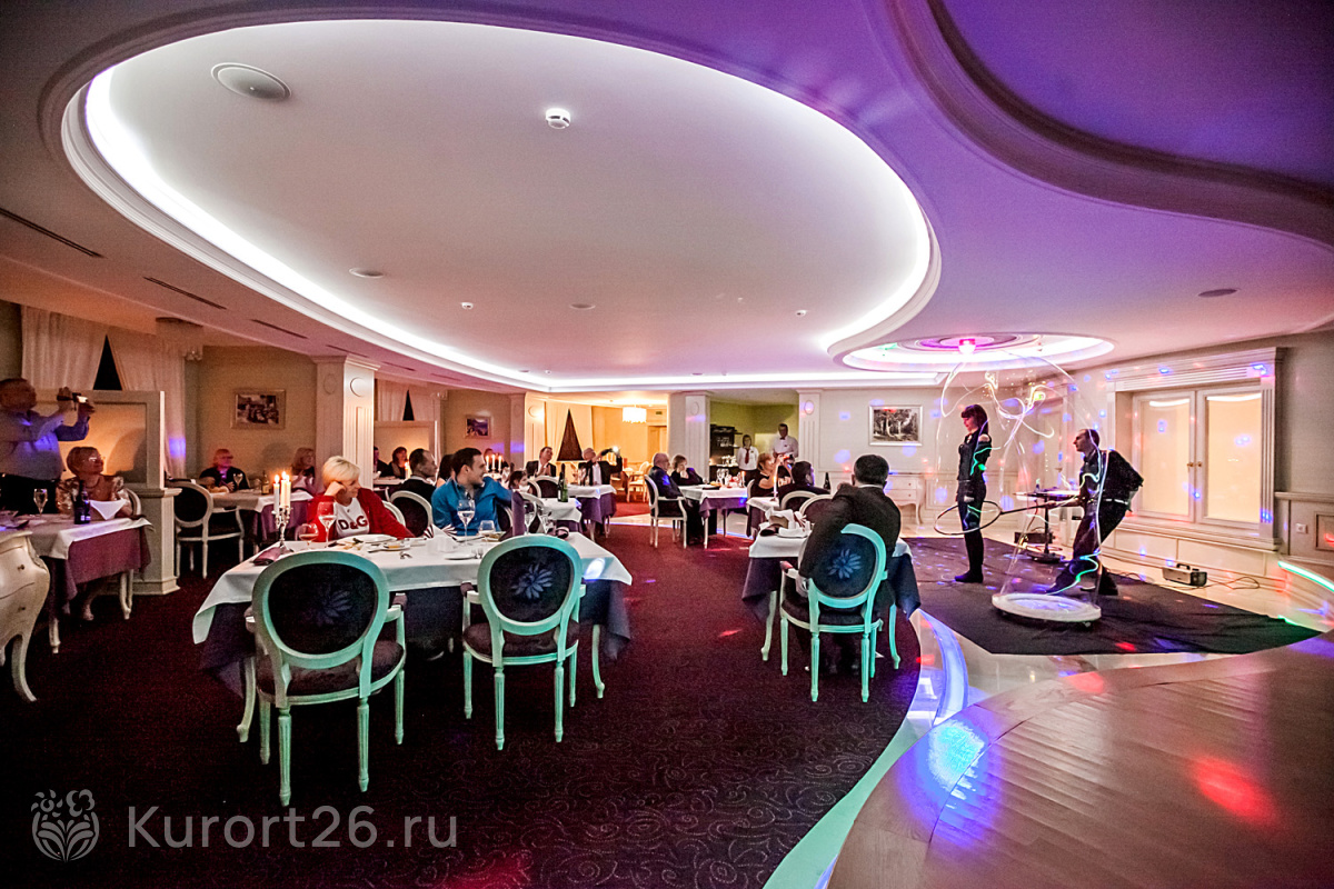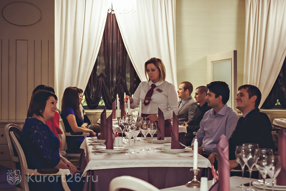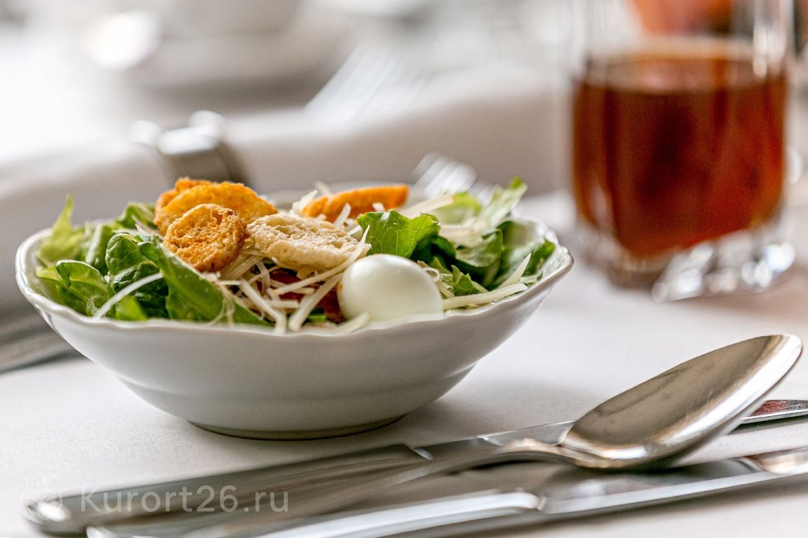 - В путёвку включено трёхразовое питание «меню-заказ». Есть отдельный зал для гостей номеров «Люкс». Индивидуальное меню по запросу: раздельное, вегетарианское. На территории работают три бара и ресторан «Империал»