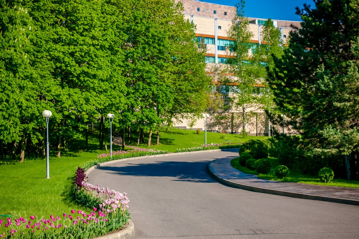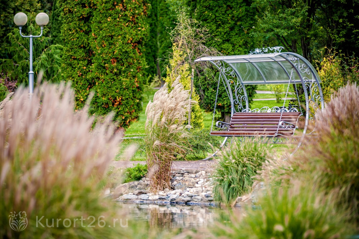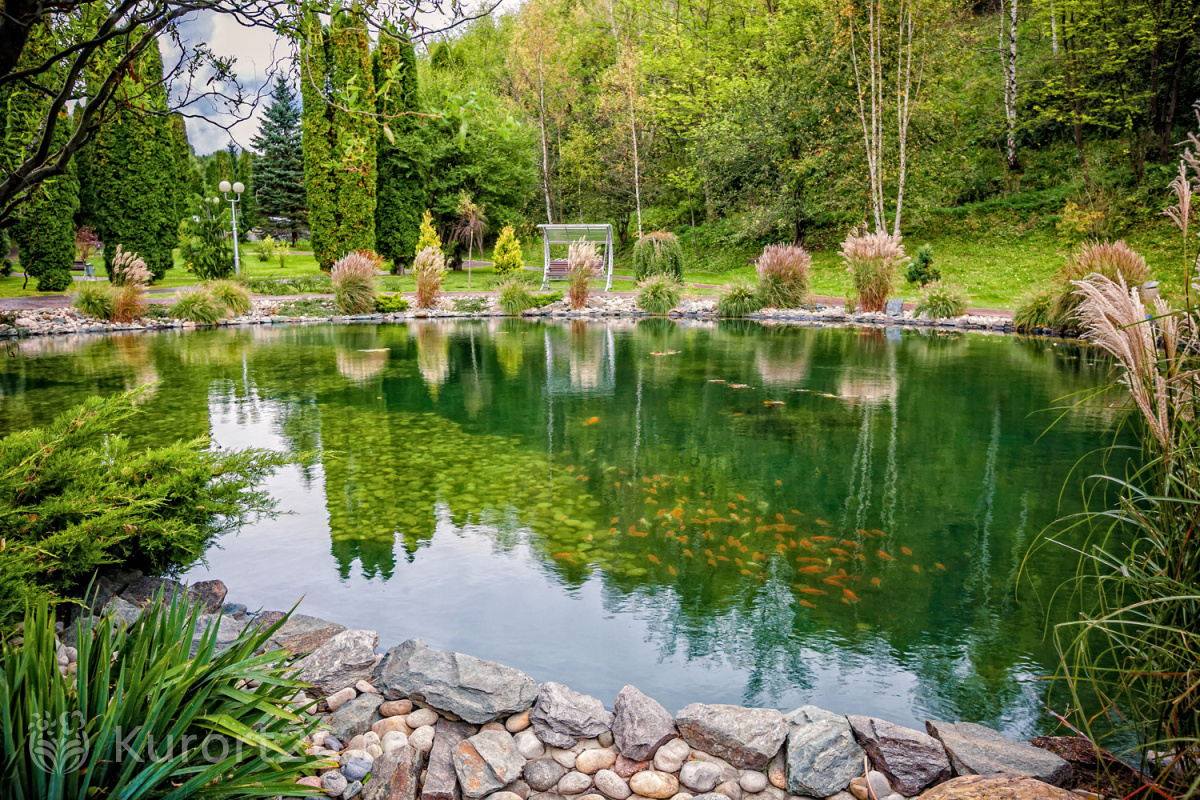 - Территория-парк с цветниками, аллеями, фонтанами, японским прудом, можжевеловой рощей, терренкурами для прогулок и гольф-полем