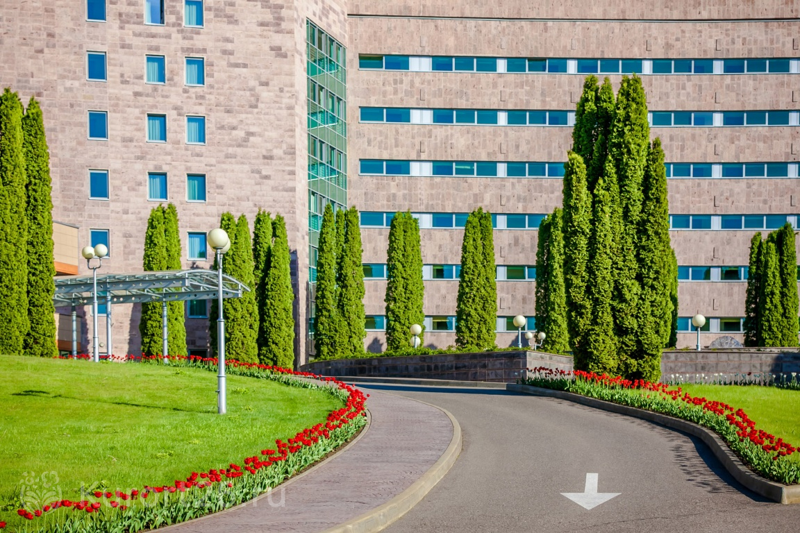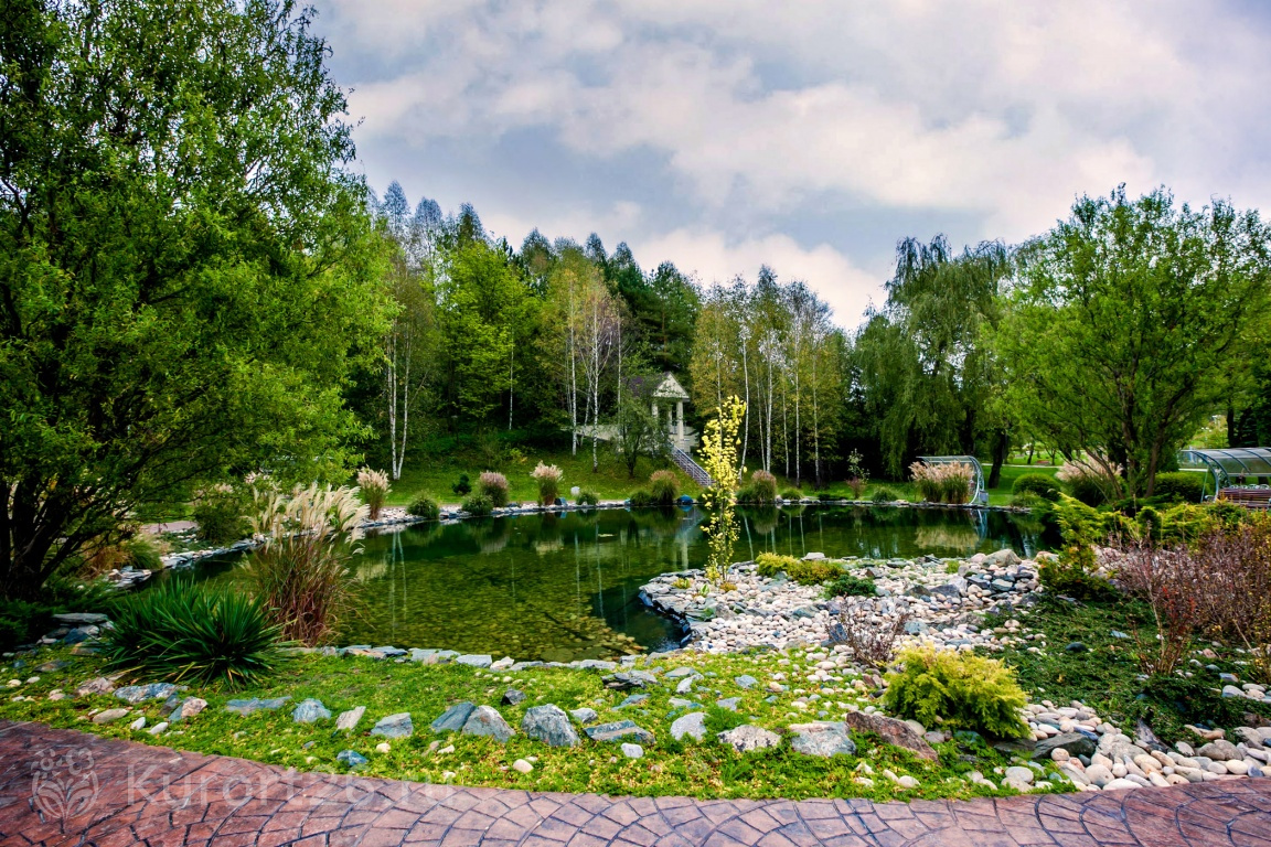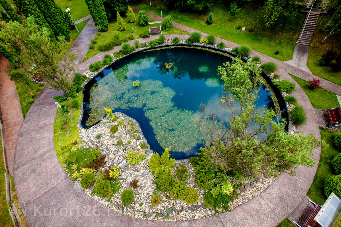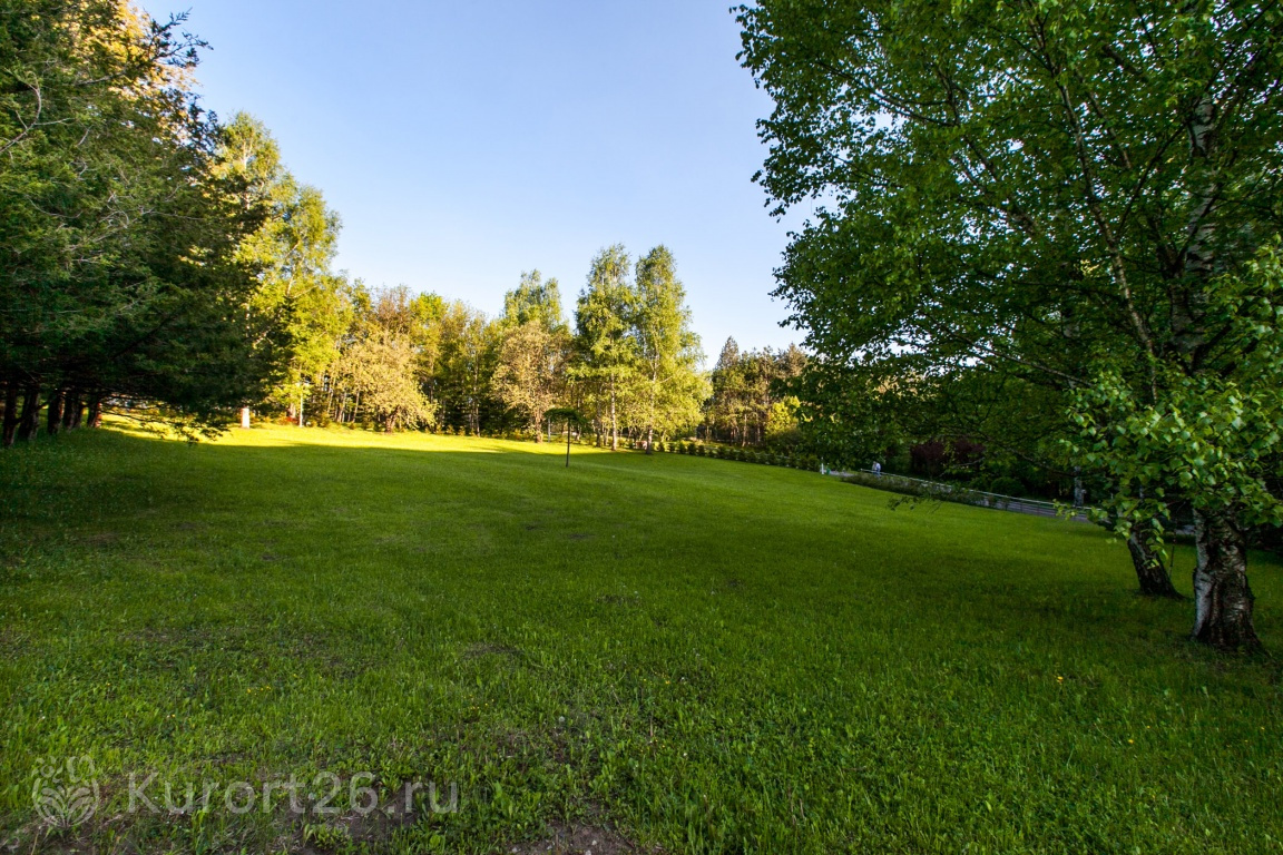 - Территория-парк с цветниками, аллеями, фонтанами, японским прудом, можжевеловой рощей, терренкурами для прогулок и гольф-полем