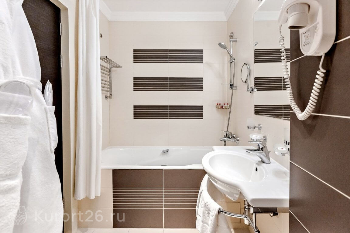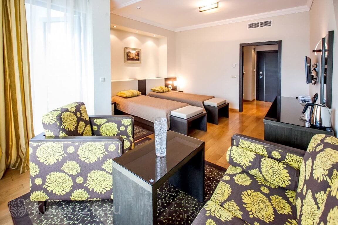 - Просторные номера площадью от 42 кв.м. В каждом номере: кровати с ортопедическими матрасами, кондиционер, сейф, чайная станция, ванная комната с душевой кабиной и ванной, косметический набор, халат, тапочки