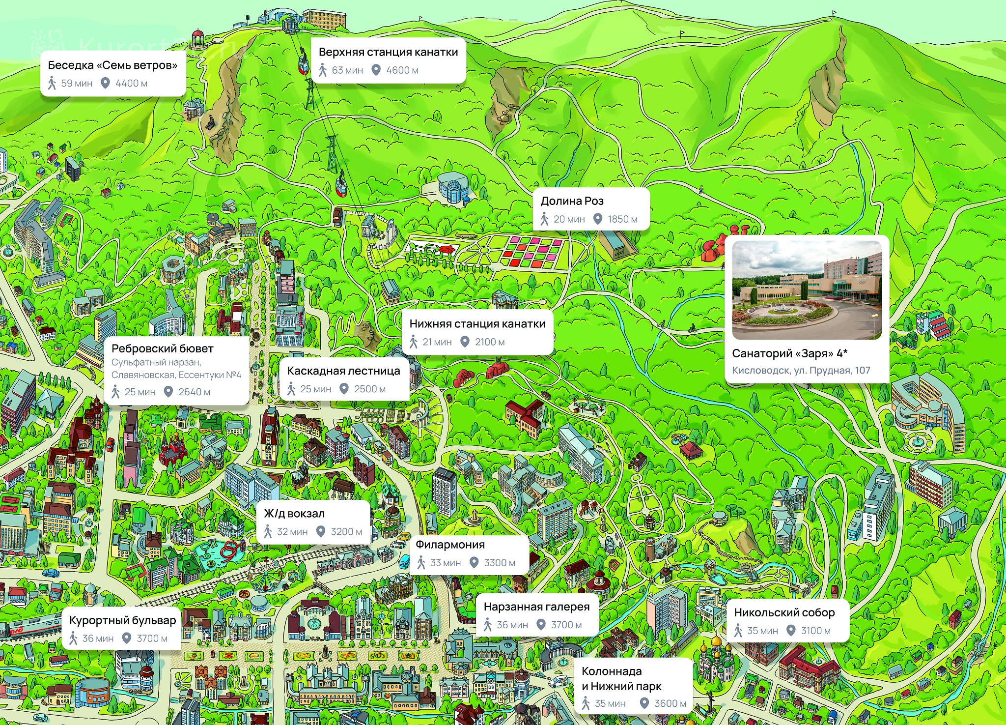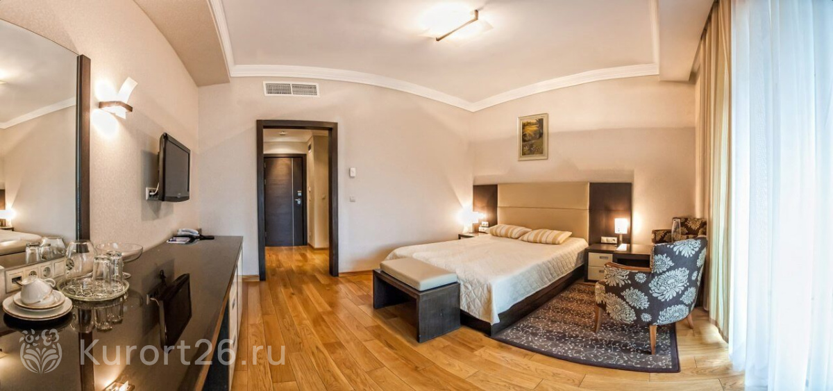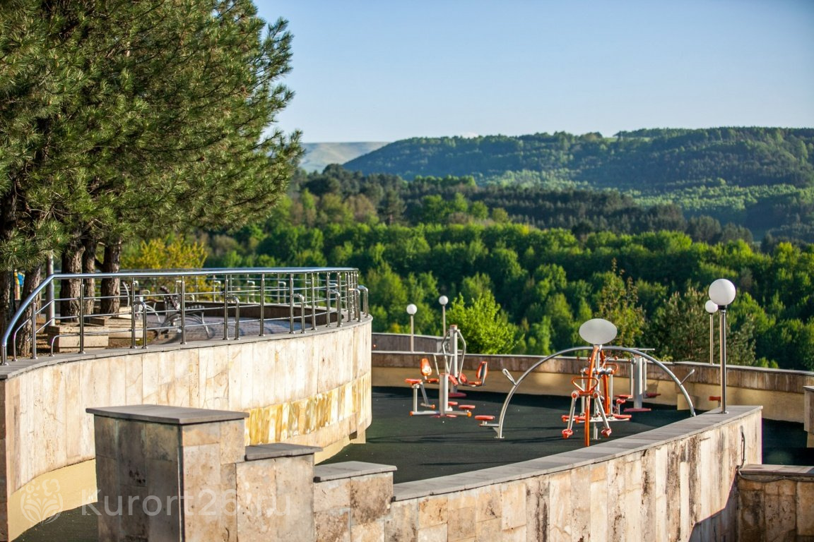 - Уединенное расположение в верхней части Курортного парка — в зоне с уникальным микроклиматом на высоте 1000 м. Прямой выход на терренкур 2Б, который ведёт к главным достопримечательностям Кисловодска: смотровым площадкам, Долине роз, Стеклянной струе, Нарзанной галерее, Курортному бульвару