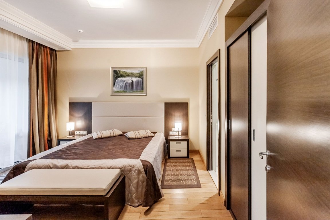 холодильник, телевизор, набор чайной посуды, ванные принадлежности, двуспальная кровать, шкаф, прикроватные тумбочки, электрочайник, стол, ванная комната