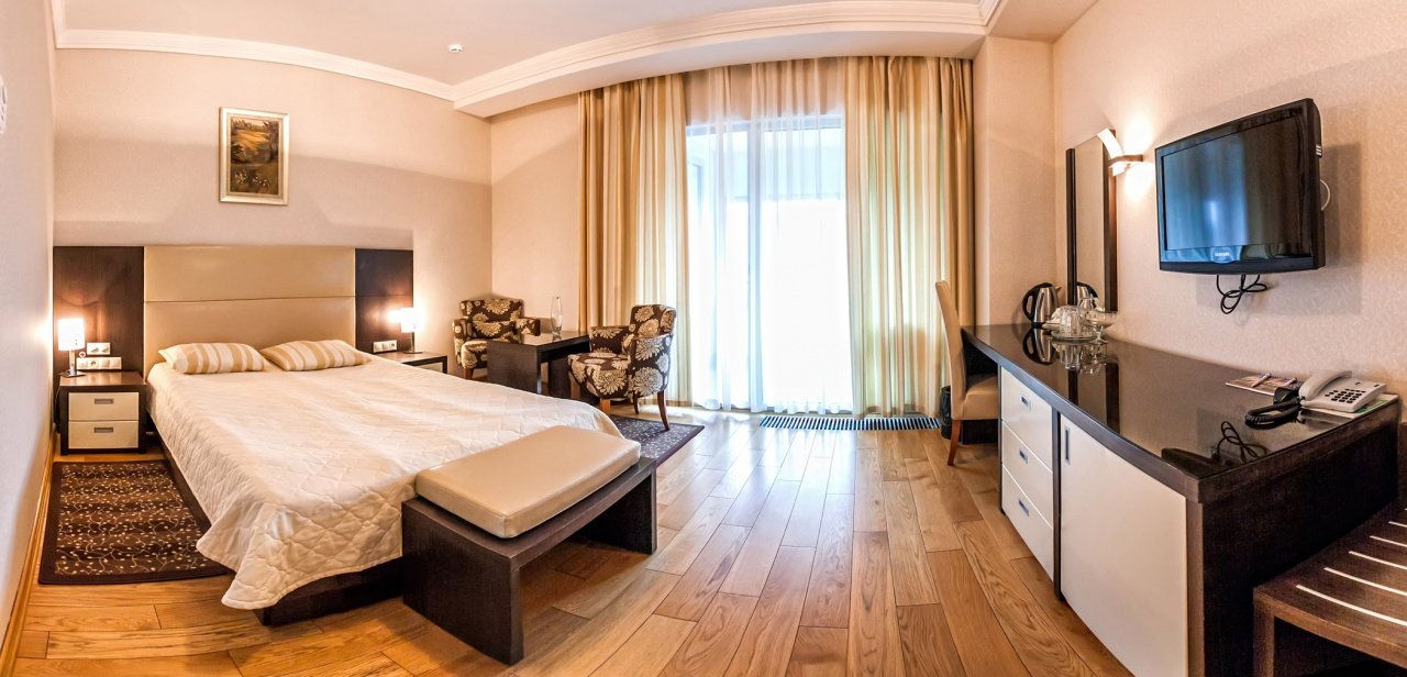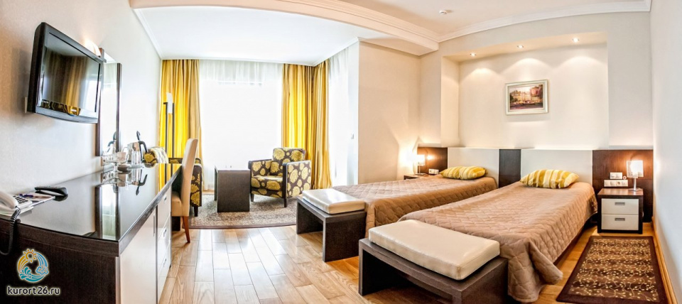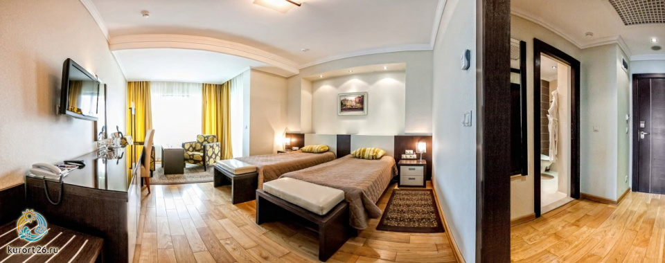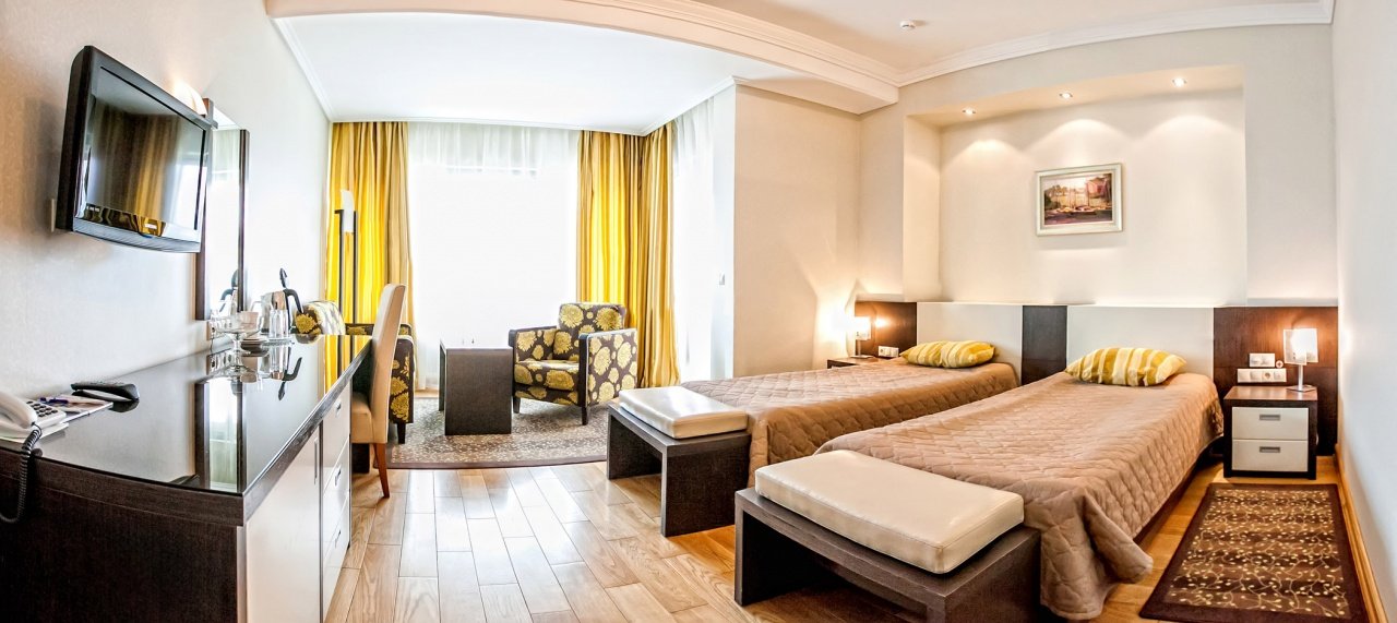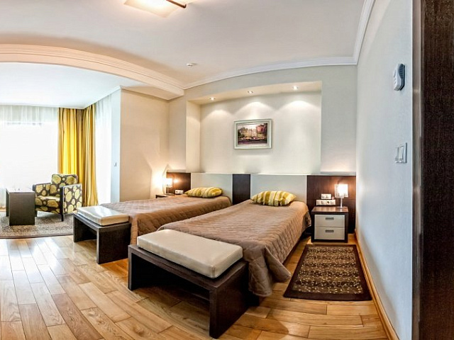 холодильник, кондиционер, телевизор, фен, набор чайной посуды, балкон, телефон, ванные принадлежности, шкаф, прикроватные тумбочки, односпальная кровать: 2 шт, диван, электрочайник, стол, ванная комната, кресло, набор уличной мебели, спутниковые каналы, гигиенические принадлежности, письменный набор, швейный набор