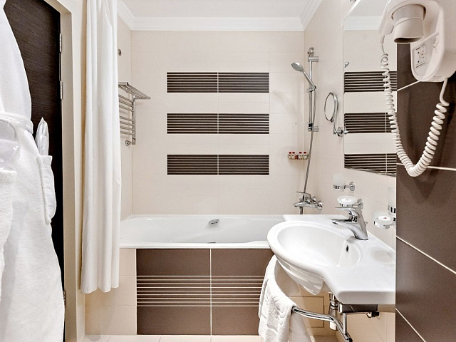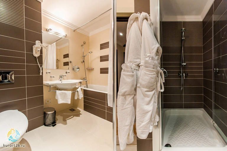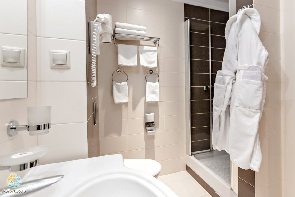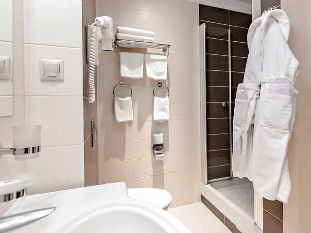 холодильник, кондиционер, телевизор, фен, набор чайной посуды, балкон, сейф, телефон, санузел с душевой кабиной, ванные принадлежности, двуспальная кровать, шкаф, прикроватные тумбочки, электрочайник, набор уличной мебели, спутниковые каналы, гигиенические принадлежности, письменный набор, швейный набор