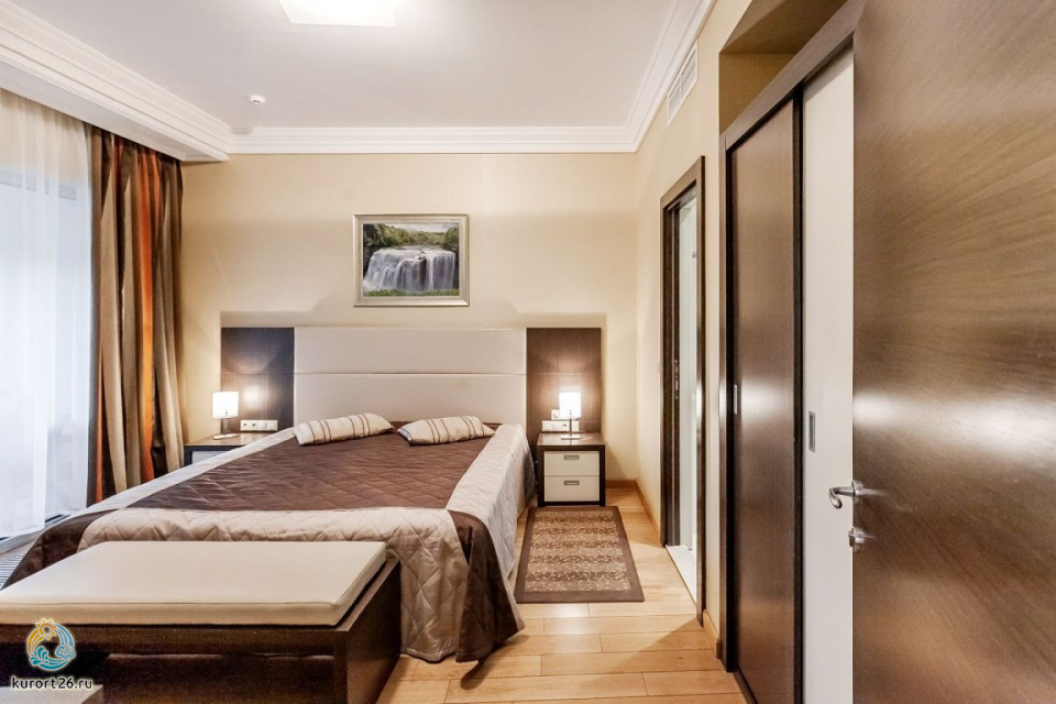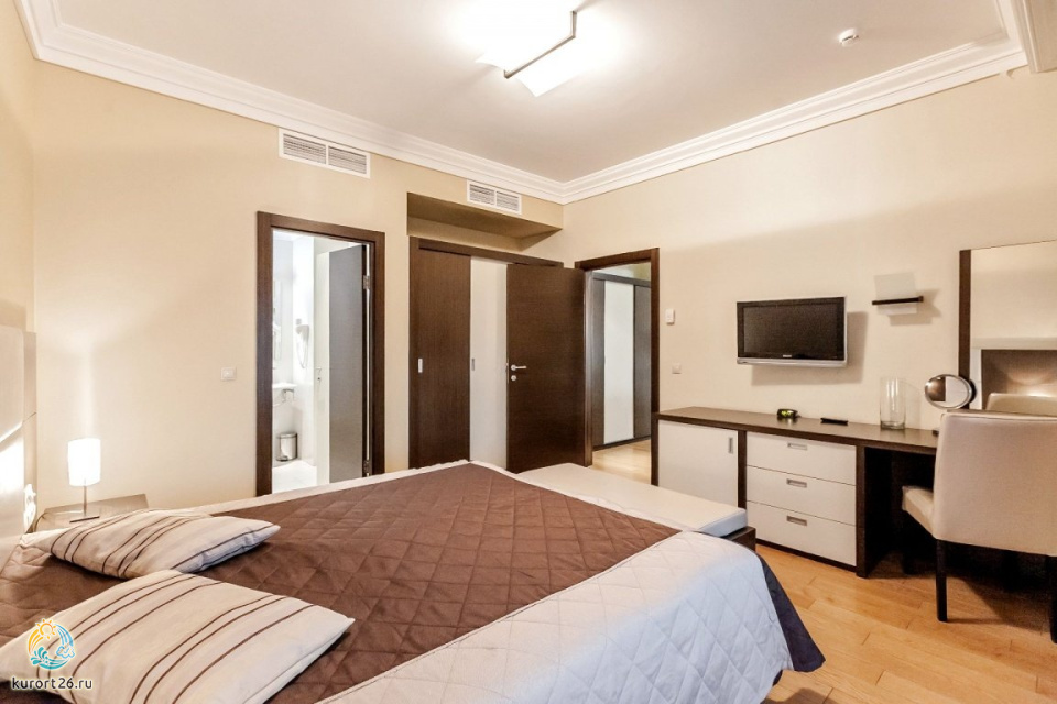 холодильник, телевизор, набор чайной посуды, ванные принадлежности, двуспальная кровать, шкаф, прикроватные тумбочки, электрочайник, стол, ванная комната