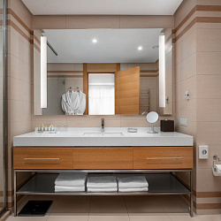 Медицинский центр 1300 кв.м. Работает 365 дней в году, включая праздничные и выходные дни. Собственный бювет с минеральной водой «Славяновская». 7 профилей лечения. Более 1500 видов процедур и 1000 видов лабораторной диагностики и ДНК-исследований. 40 видов ванн и 6 видов лечебных душей, грязелечение, большой выбор физиотерапии. Мануальная терапия и 8 типов массажа, мягкое вытяжение позвоночника Robospine. - Ессентуки 990 м до бювета «Пятитысячник»Ведущий санаторий России по уровню комфорта и лечения • Медицинский центр работает без выходных, включая праздничные дни • Бассейн 652 кв.м. (25×65 м) с термотерапией, джакузи, каскадом и морской волной. Глубина от 30 до 180 см, есть отдельная детская зона. Рядом расположены закрытая терраса с шезлонгами, комфортные раздевалки • Термальная зона: финская сауна, хаммам, сенная баня на альпийских травах, египетская баня Расул с вулканической глиной, Душ впечатлений (бриз, тропический душ с ароматерапией), дорожки Кнейппа, ледяной фонтан IceFall System, кедровая бочка, релакс-бассейн 10×2,7×2 м с гидромассажем и цветотерапией • Уединенное расположение рядом с парком Победы. Территория 6 га с двумя терренкурами (600 м и 1 км). Удобные теплые переходы между корпусами • Бювет с минеральной водой Ессентуки 4, Ессентуки Новая—2. 10 минут до питьевой галереи «Пятитысячник» с минеральной водой Ессентуки 17 • Номера с панорамными окнами с видом на Эльбрус, Кавказский хребет, парк санатория. Во всех номерах: хороший Wi-Fi, климат-контроль, сейф, холодильник, чайная станция, фен, халат, тапочки, косметический набор • Трехразовое питание «шведский стол» в ресторане Скандинавия и VIP-зале Сан-Сити. Отдельный зал Диет-Холл для гостей по путевке «Детокс». Ежедневно в меню более 100 блюд и закусок • Хорошая программа развлечений: художественные и творческие мастер-классы, настольные игры, кинопоказы, танцевальные вечера, шоу • Здоровое движение: 6 видов ЛФК, аквааэробика, йога на свежем воздухе, фитнес-тренировки, тренажерный зал, теннисный корт, открытая спортплощадка, уличные тренажеры, терренкуры, прокат велосипедов, бильярд, настольный теннис • Отдых с детьми от 1 года, лечение — с 4-х лет. Для детей: стульчик для кормления, кроватка, манеж, горшок, ванночка, подставка для ног, обогреватель. Работает детский клуб с аниматорами, открытая игровая площадка. Две программы анимации для детей и подростков с 10:00 до 21:30: подвижные игры, мастер-классы, викторины, дискотеки, научное шоу и шоу мыльных пузырей, мультфильмы, видеоигры • Врачи 14 профилей. Более 300 видов анализов. Диагностика УЗИ, ТРУЗИ, ЭКГ, Холтер, РЭГ, РВГ, денситометрия (диагностика плотности костей), эластометрия печени, эндоскопические исследования (РРС, ФГС), офтальмологическая диагностика, ИМАГО-технологии • 30 видов лечебных ванн и душей, включая ванны с минеральной водой, подводный душ-массаж, сухие углекислые и пароуглекислые ванны • Сильное направление «Детокс и похудение»: прием диетолога, отдельный зал питания, биоимпедансный анализ, тестирование жировой массы с антропологическим исследованием. Липолиз, спа-капсулы SlimLine и Cologen Oxy Jet, вакуумно-роликовый массаж Starvac, детокс-обертывания Thalasso Bretagne, радиоволновой лифтинг Reaction • Мануальная терапия и медицинский массаж. Более 10 видов спа-массажа: моделирующий, антицеллюлитный, лимфодренажный, нейроседативный, турецкий, массаж бамбуковы