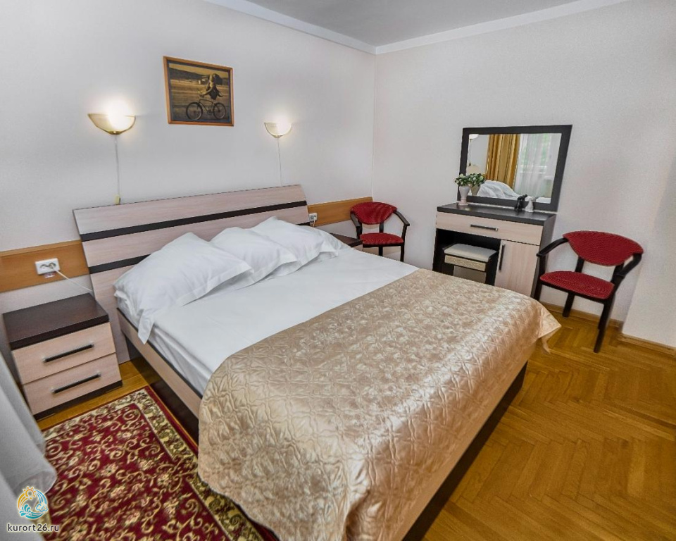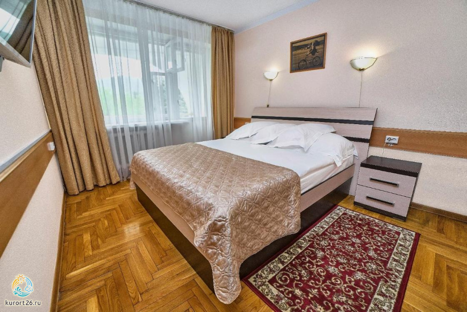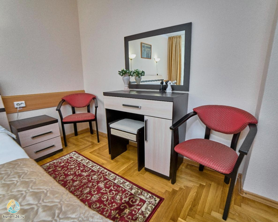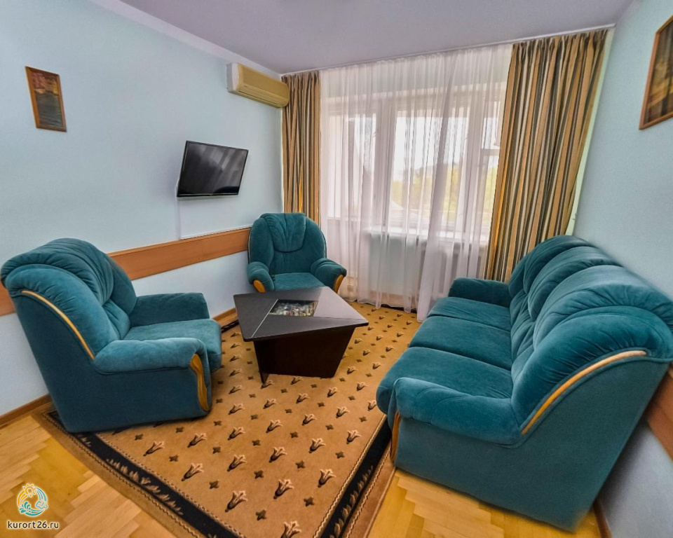 Двухместный двухкомнатный номер люкс оснащён: двумя односпальными кроватями , двумя прикроватными тумбочками, шкафом, диваном, двумя креслами, столом со стульями, телевизором, холодильником, гладильной доской с утюгом, сушилкой, электрочайником, набором посуды. Некоторые номера оснащены кондиционером.