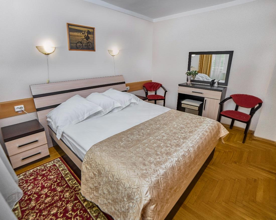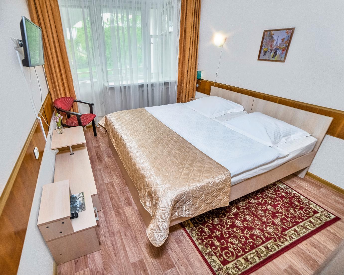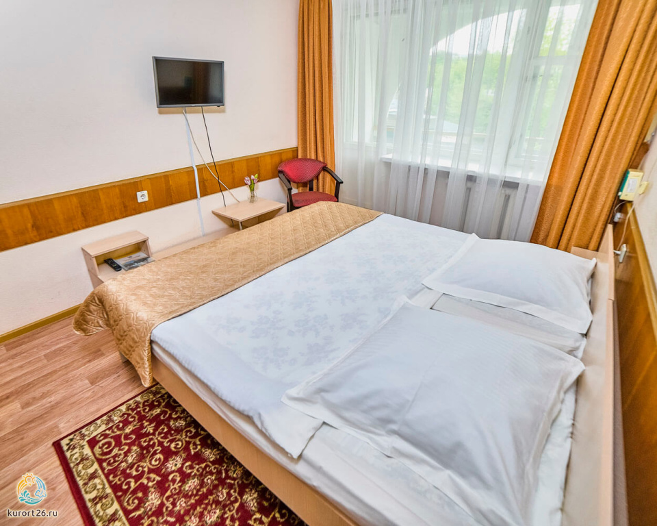 телевизор, фен, набор чайной посуды, санузел с душевой кабиной, ванные принадлежности, тапочки, двуспальная кровать, шкаф, прикроватные тумбочки, утюг с гладильной доской, электрочайник, стол, халаты, набор полотенец, мини-холодильник