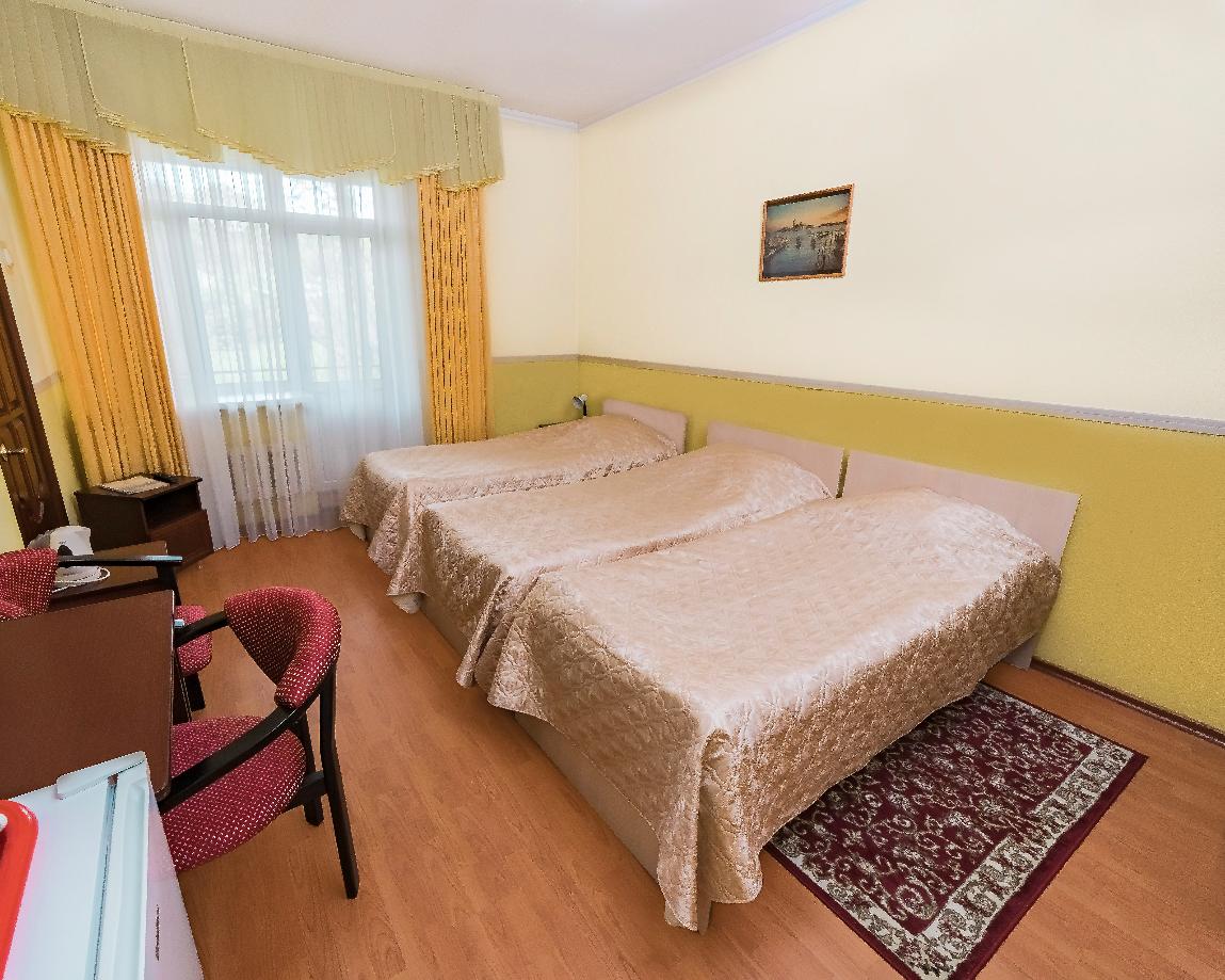 телевизор, санузел с душевой кабиной, набор мягкой мебели, прикроватные тумбочки, шкаф-купе, электрочайник, стол, посуда, набор полотенец, три односпальные кровати, мини-холодильник