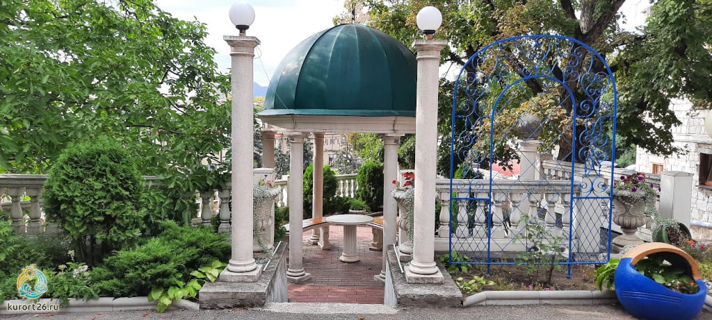 Территория санатория — это ухоженный парк с тенистыми аллеями, газонами, цветочными клумбами, детской площадкой и уютными беседками.