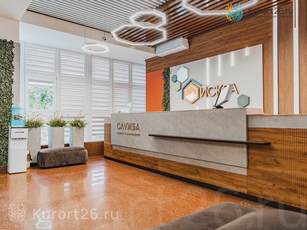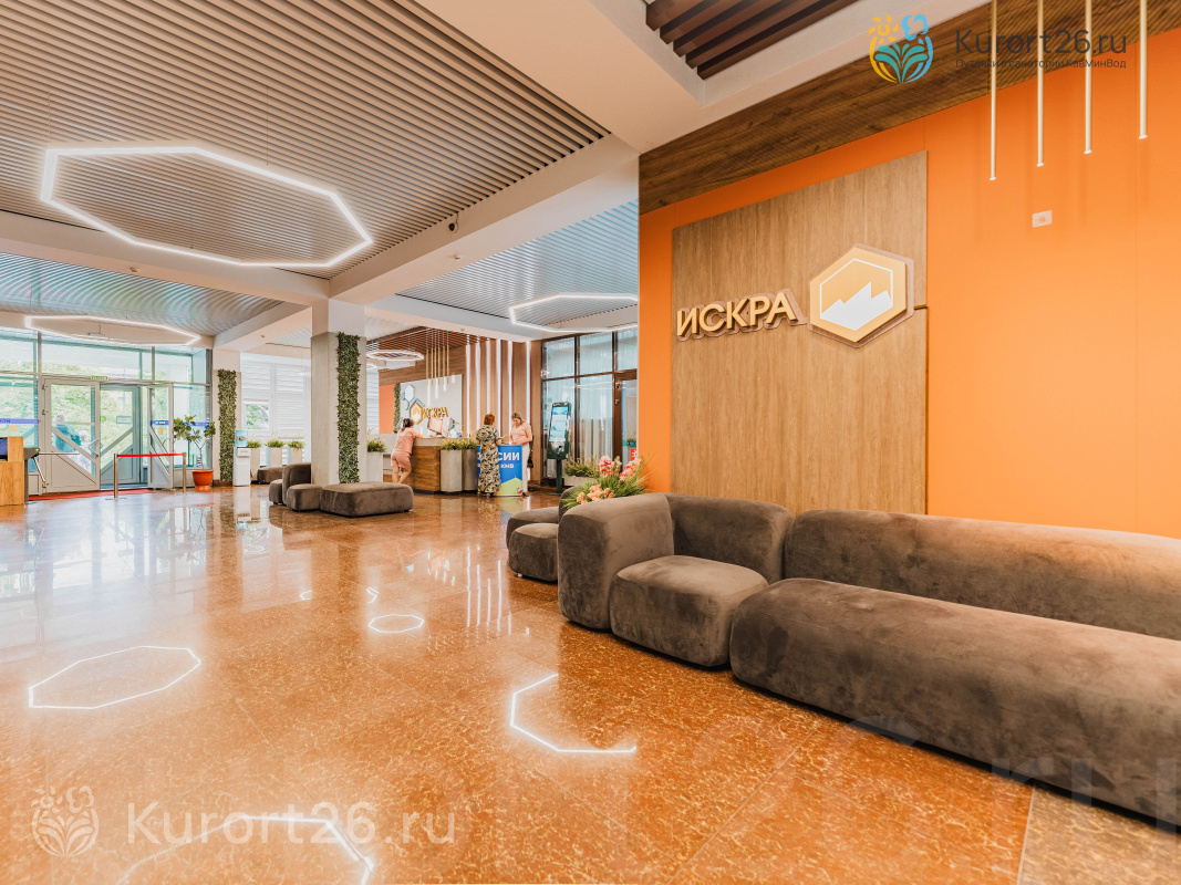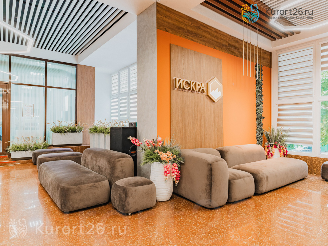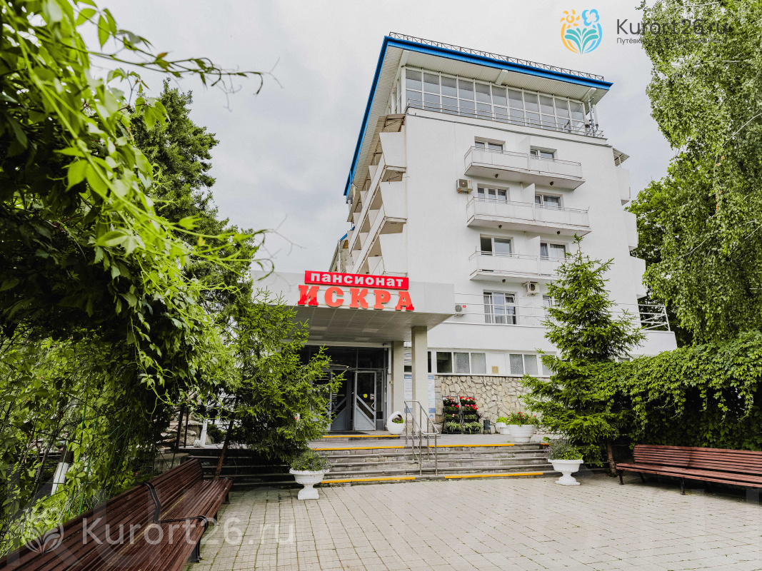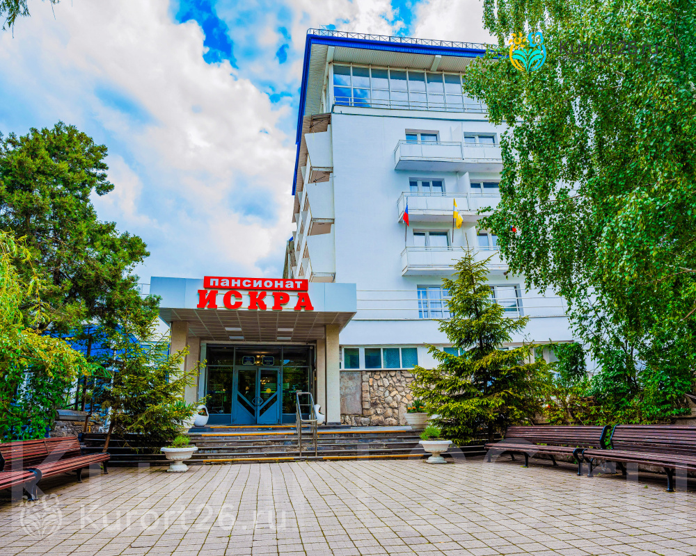 Пансионат «Искра» находится в центре курортной зоны, рядом с парком «Цветник». Пансионат расположен в окружении питьевых источников, радонолечебниц и грязелечебниц. В пяти минутах пешей прогулки от пансионата находится питьевой источник №1, от которого начинаются все три терренкура города.