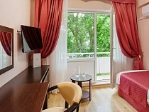 холодильник, кондиционер, чайник, фен, балкон, интернет в номере, санузел с душевой кабиной, ванные принадлежности, шкаф, односпальная кровать, зеркало, журнальный столик, набор полотенец