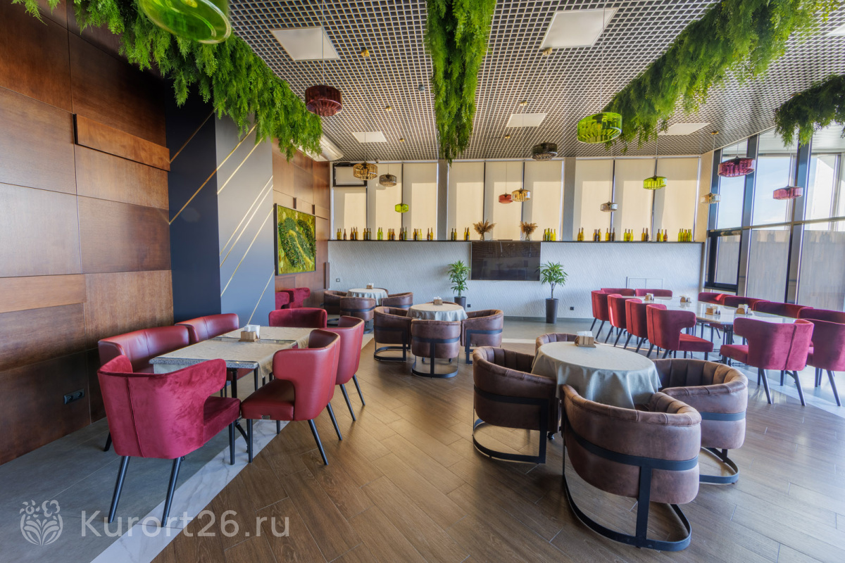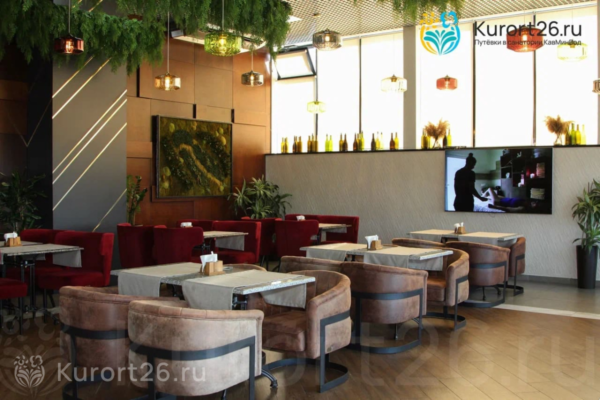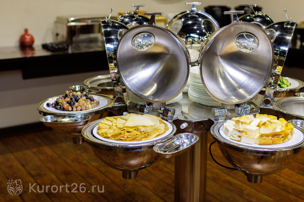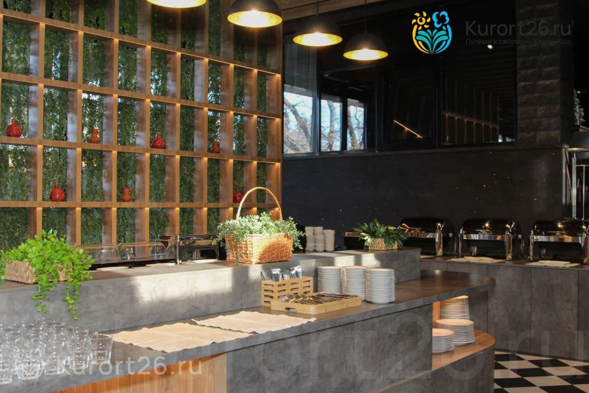В цену проживания включён завтрак «шведский стол», который сервируется на красивой террасе. На 9 этаже санатория расположен уютный ресторан, рассчитанный всего на 30 мест. Из окон открывается головокружительный вид на лесопарк и гору Бештау.