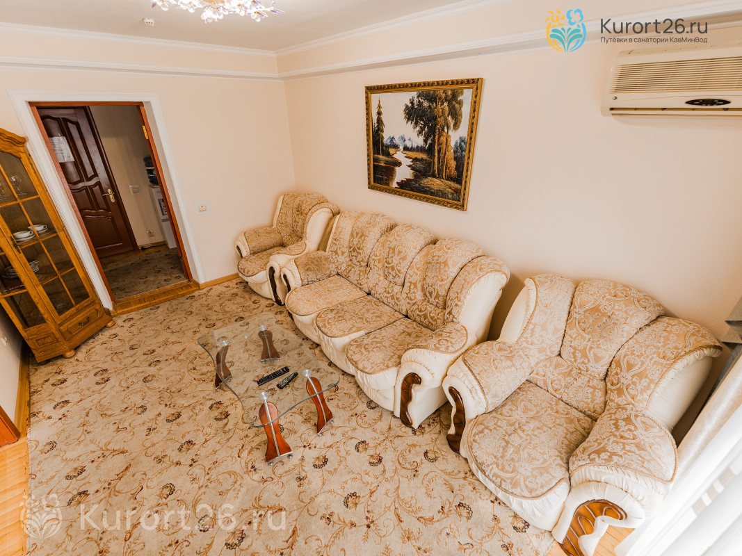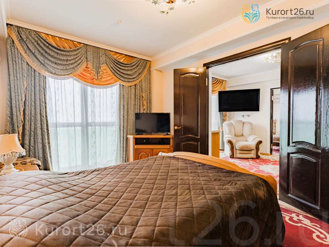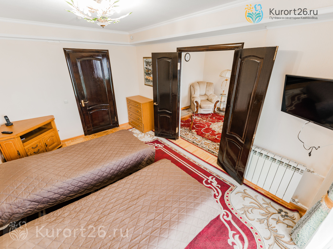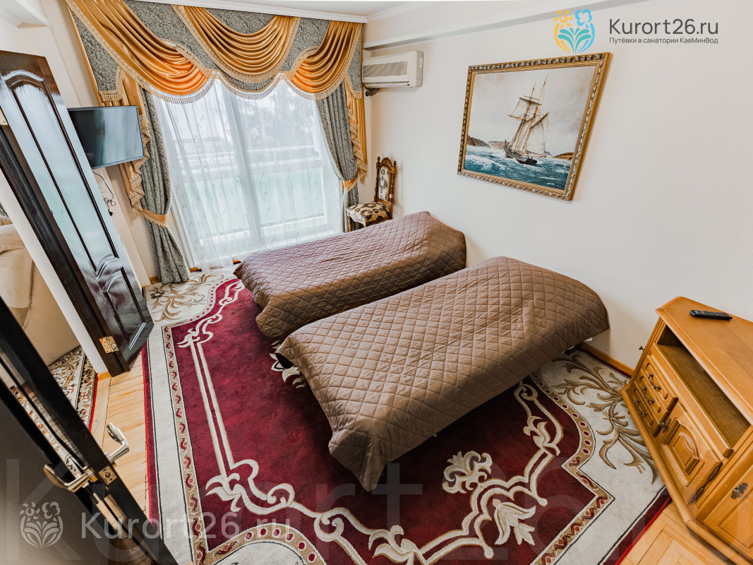 - 3-комнатный «Сьют». Площадь номера 80 кв.м. Состоит из гостиной и двух спален. Предусмотрено два санузла с гидромассажной душевой кабиной и джакузи. В спальнях: двуспальная кровать с ортопедическим матрацем, две полутороспальные кровати с ортопедическими матрацами, журнальный столик, торшер, зеркало. В номере: кондиционер, телевизор, холодильник, туалетный столик с зеркалом, диван и мягкие кресла, тумбочки, туалетный столик с зеркалом, комод для белья, настольные лампы, картины, пуфик. Есть сейф, фен, WI-Fi, ванные принадлежности, при заезде чай, кофе, сахар, вода. Прихожая оснащена платяным шкафом с набором средств по уходу за верхней одеждой и обувью.