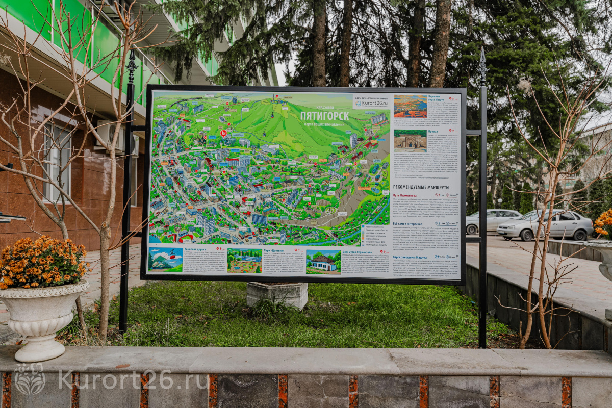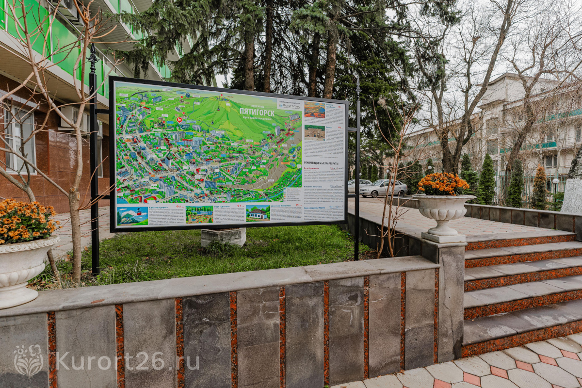 В пяти минутах ходьбы от санатория находится парк «Цветник». В 200 метрах от санатория расположена нижняя станция канатной дороги, которая ведёт на вершину горы Машук.