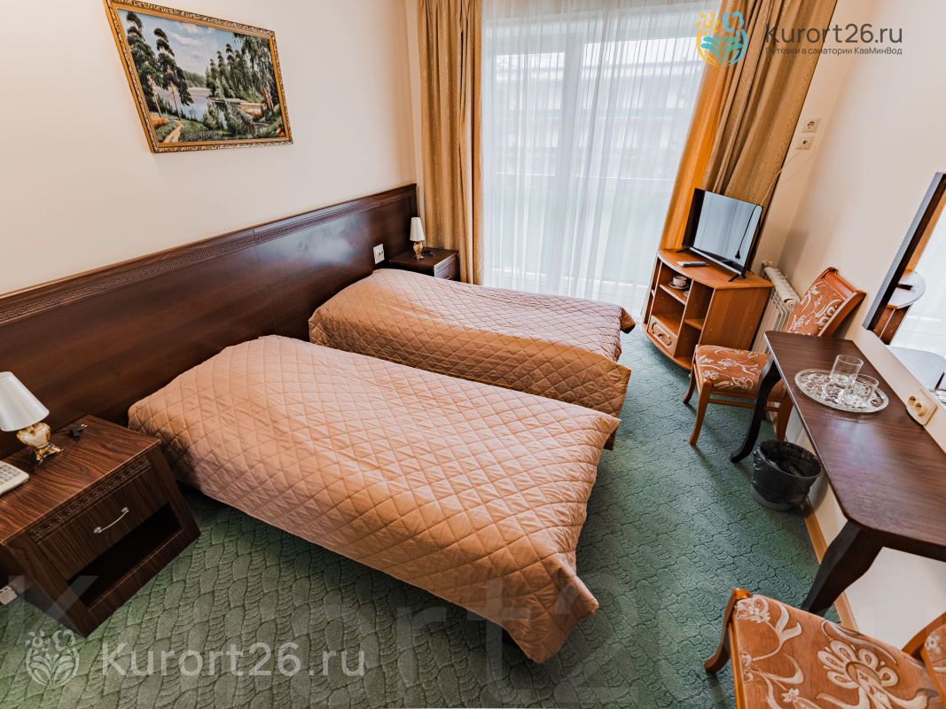- «Стандарт» 1 категории. Площадь номера 20,2 кв.м. В номере: две полутороспальные кровати с ортопедическими матрацами, телевизор, холодильник, тумбочки, туалетный столик с зеркалом, настольные лампы, картины, прикроватные коврики. Прихожая оснащена платяным шкафом с набором средств по уходу за верхней одеждой и обувью. Есть сейф, фен, WI-Fi, халат, тапочки, ванные принадлежности, при заезде предоставляется чай, кофе, сахар, вода. Санузел с душевой кабиной. На балконе — шезлонги;