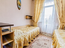 холодильник, кондиционер, телевизор, чайник, набор чайной посуды, балкон, шкаф, набор мягкой мебели, прикроватные тумбочки, односпальная кровать: 2 шт, ванная комната