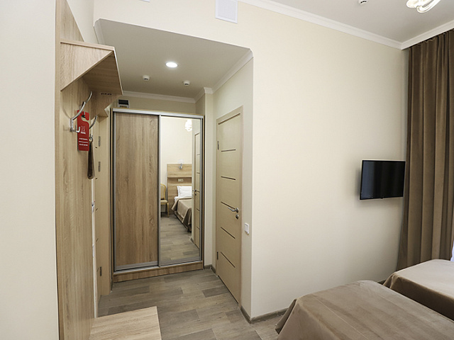 холодильник, телевизор, фен, душ, шкаф, односпальная кровать: 2 шт, две прикроватные тумбочки