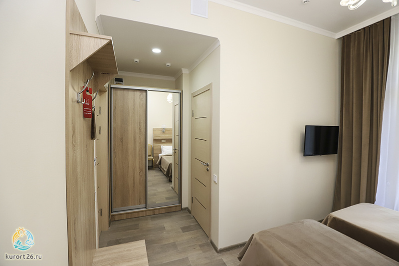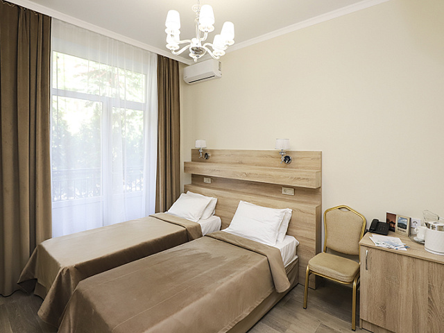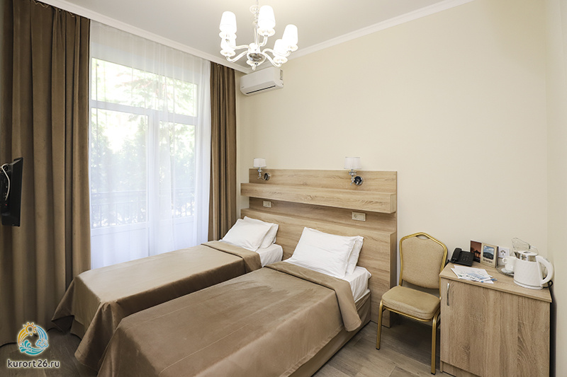 холодильник, кондиционер, телевизор, набор чайной посуды, душ, шкаф, односпальная кровать: 2 шт, две прикроватные тумбочки, электрочайник