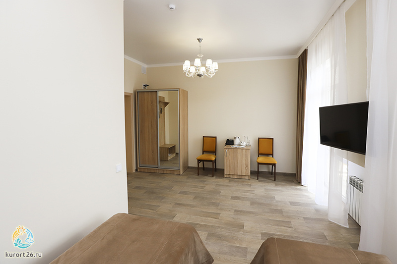 холодильник, кондиционер, телевизор, чайник, набор чайной посуды, балкон, шкаф, набор мягкой мебели, прикроватные тумбочки, односпальная кровать: 2 шт, ванная комната
